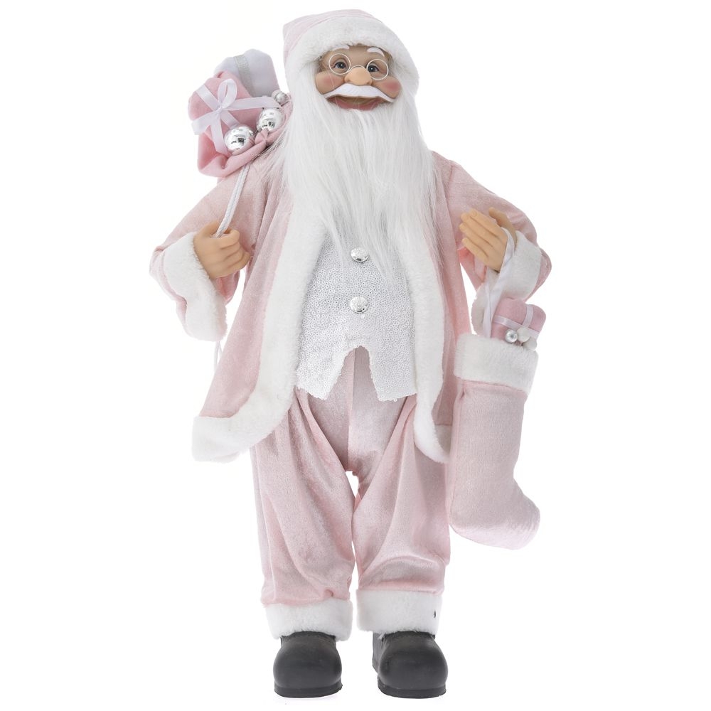 Άγιος Βασίλης διακοσμητική φιγούρα με λευκά και ροζ βελουτέ ρούχα που κρατάει δώρα 80 εκ