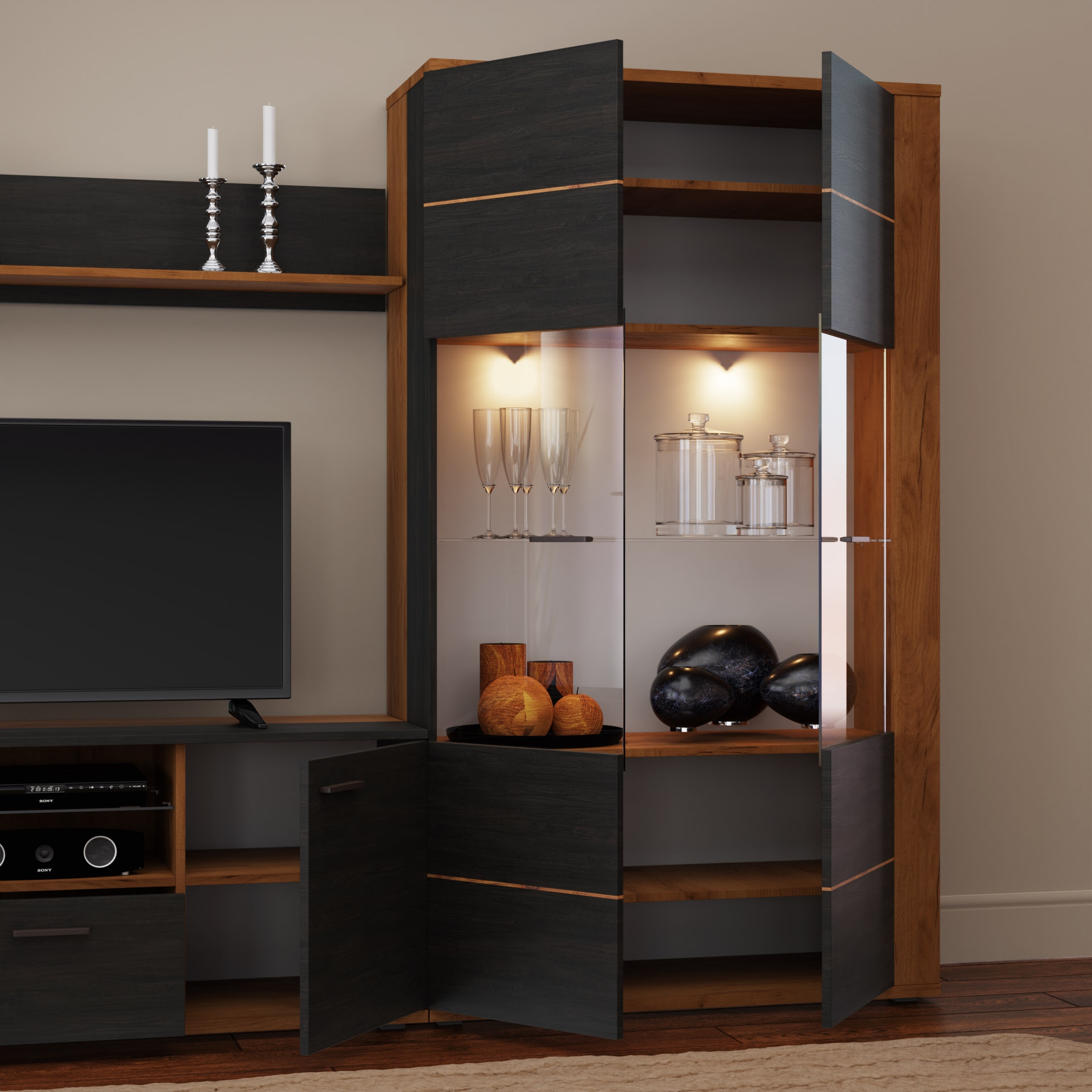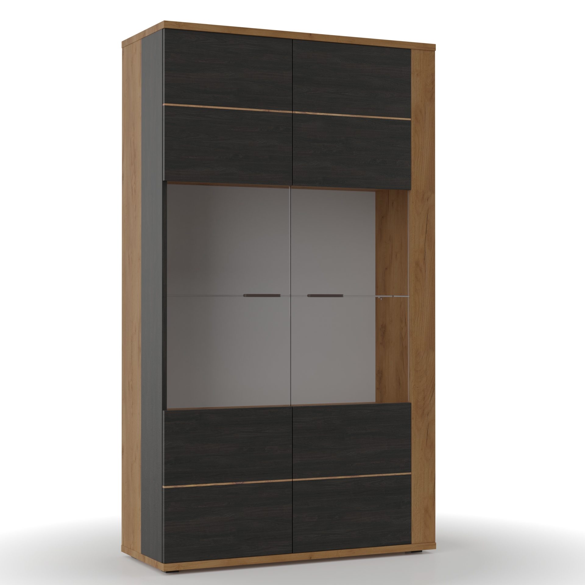 <p>Βιτρίνα ADEL, Η αντισυμβατική σχεδίαση με αυστηρές γεωμετρικές γραμμές το κάνει ξεχωρίζει από άλλα έπιπλα και δίνει στο χώρο ζεστασιά, σε αυτό συμβάλλει και ο πρωτότυπος χρωματισμός του με Χρώμα Καπνού (tobacco) και γκρι (Northern tree) και τα λιτά Μαύρα χερούλια , η διάσταση είναι 95.1x39.6x167.5.<br>