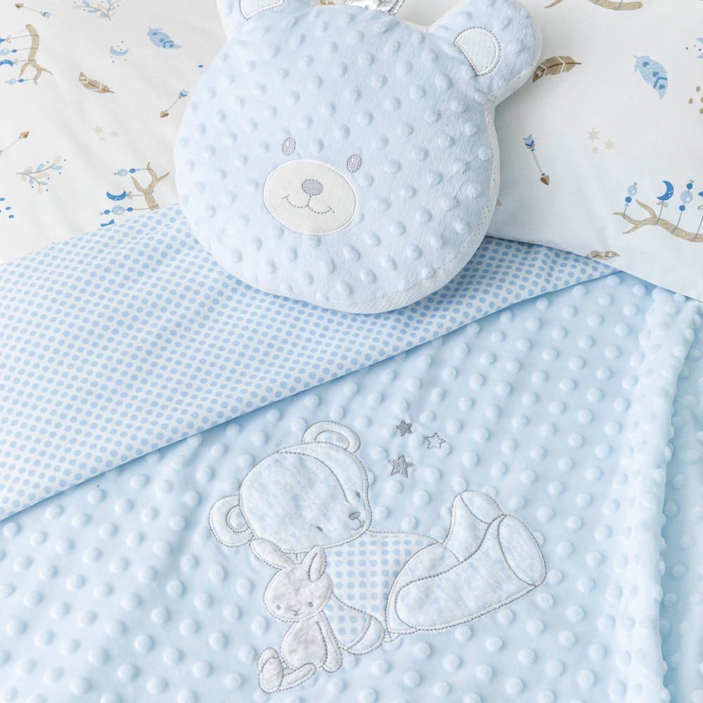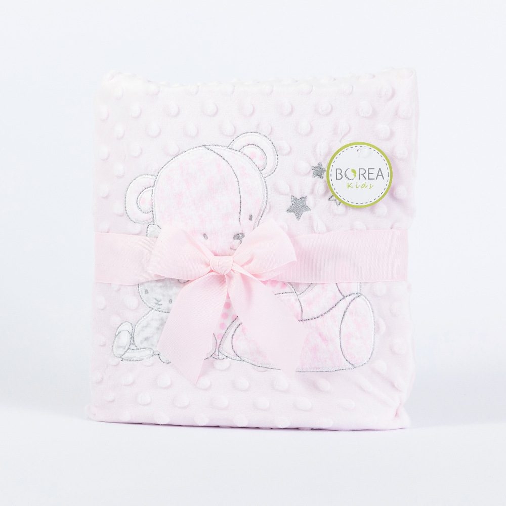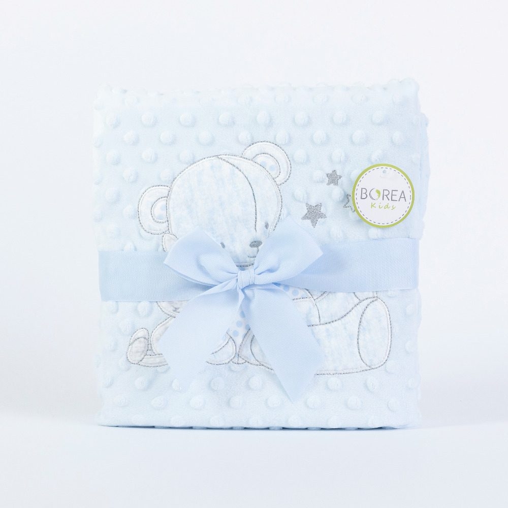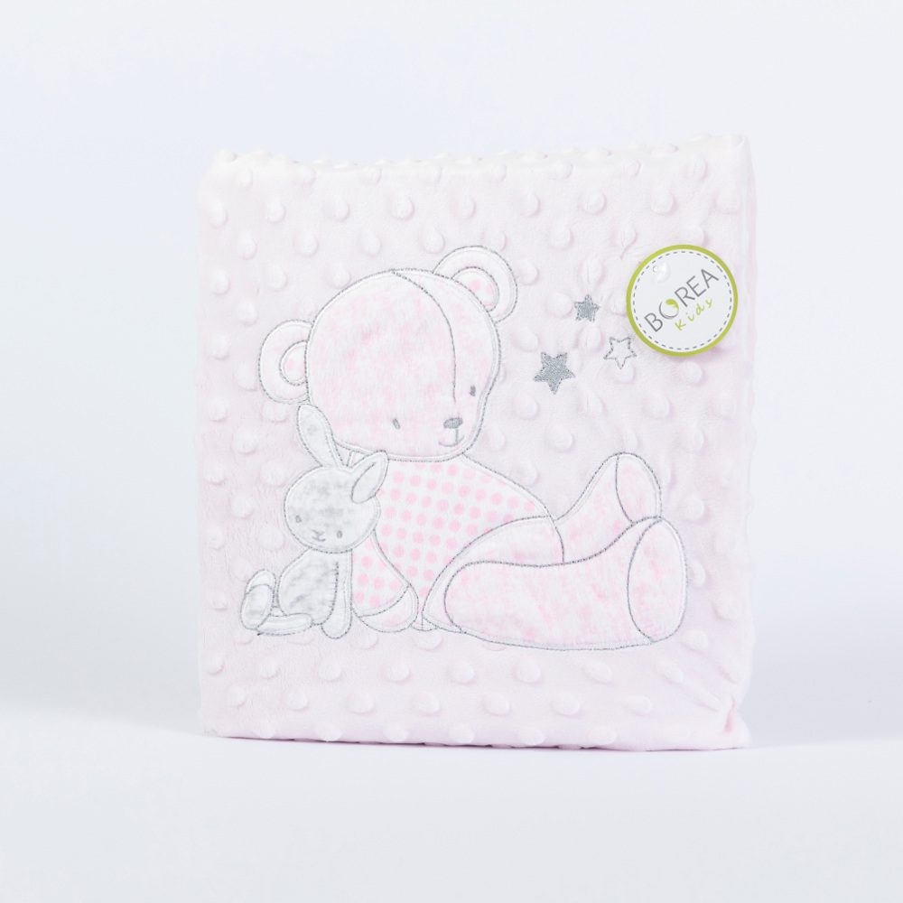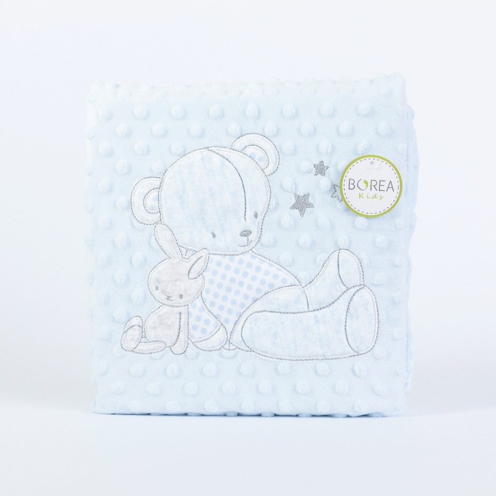 <p>Κουβέρτα αγκαλιάς από ύφασμα micromink, μονόχρωμο, ανάγλυφο, με φούσκες, κέντημα και διακοσμητική φάσα περιμετρικά στην μπροστινή όψη από ύφασμα εμπριμέ,jersey ίδιο με την πίσω όψη, 100% πολυέστερ. Διατίθεται σε 2 χρώματα.</p>