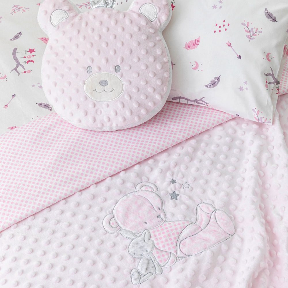 <p>Κουβέρτα αγκαλιάς από ύφασμα micromink, μονόχρωμο, ανάγλυφο, με φούσκες, κέντημα και διακοσμητική φάσα περιμετρικά στην μπροστινή όψη από ύφασμα εμπριμέ,jersey ίδιο με την πίσω όψη, 100% πολυέστερ. Διατίθεται σε 2 χρώματα.</p>