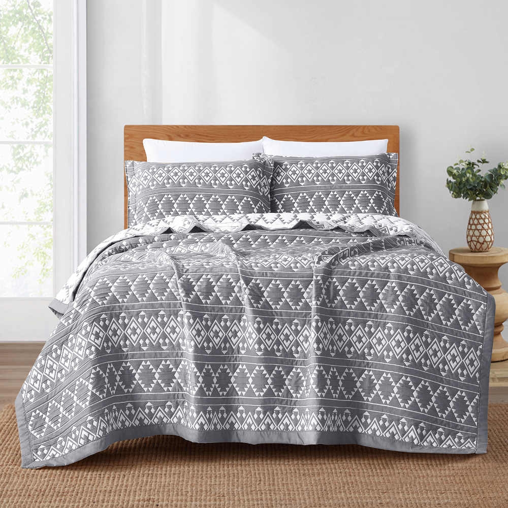 <p>Σετ κουβέρτα καλοκαιρινή πολυτελείας υπέρδιπλη με μαξιλαροθήκες oxford style από ύφασμα ζακάρ, 100% πολυέστερ, με γραμμικό σχέδιο και μόνοχρωμη φάσα, σχέδιο aztek, χρώμα ανθρακί.</p>