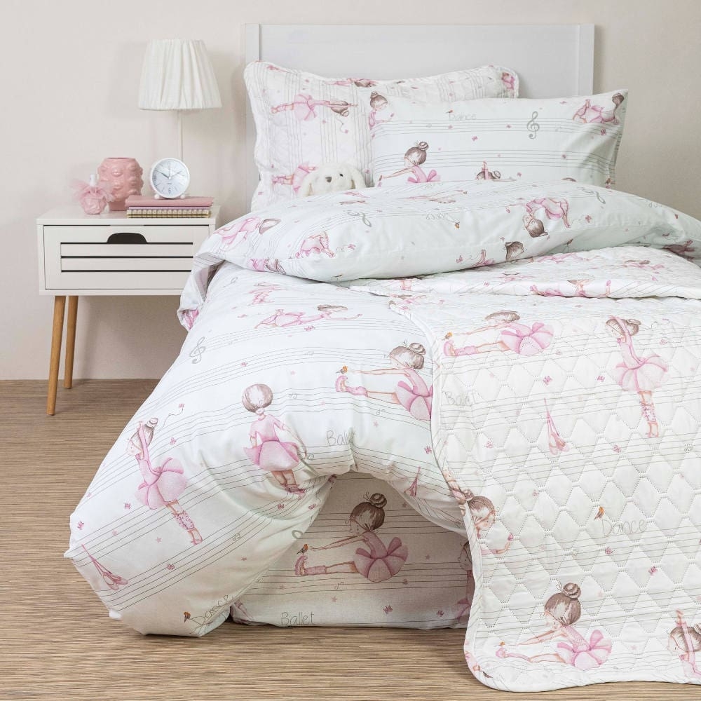 <p>Παπλωματοθήκη μονή από ύφασμα μερσεριζέ, 144 κλωστών, 100% βαμβακερό, με φερμουάρ, εμπριμέ, με παιδικό σχέδιο με μπαλαρίνες.</p>