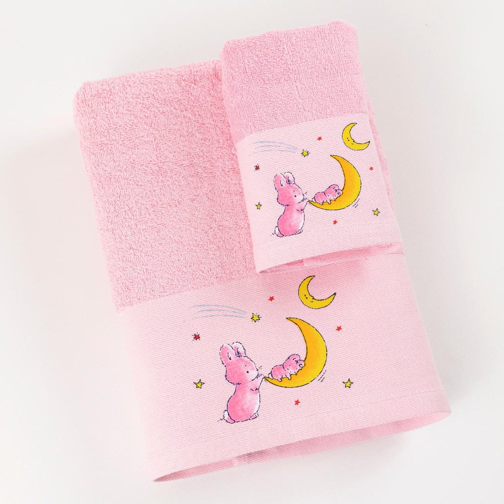 <p>Σετ πετσέτες 2 τεμαχίων, μπάνιου και χειρός, από ύφασμα φροτέ πενιέ, 100% βαμβακερό, μονόχρωμο, ροζ, με απλικέ, σχέδιο με λαγουδάκια.</p>