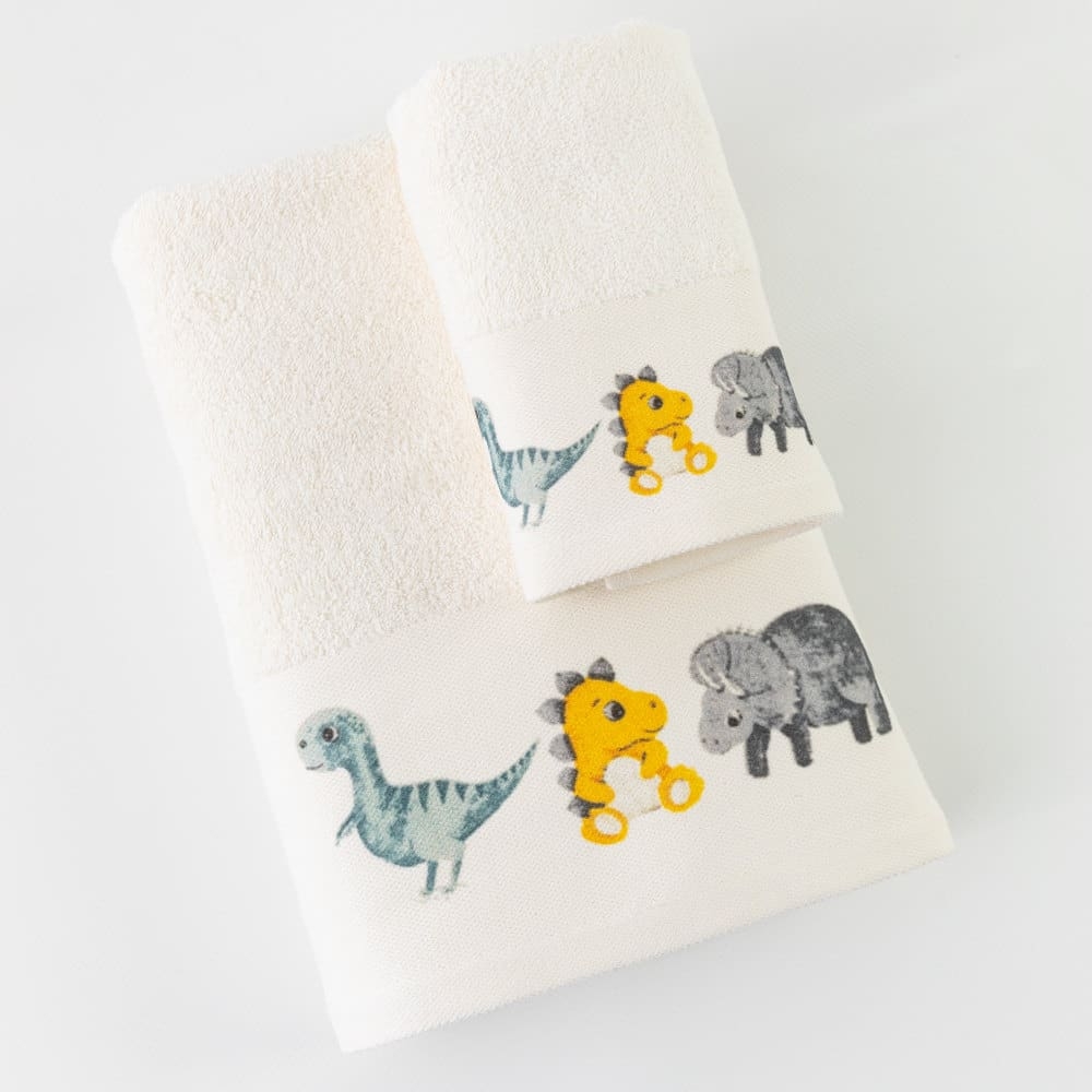 <p>Σετ πετσέτες 2 τεμαχίων, μπάνιου και χειρός, από ύφασμα φροτέ πενιέ, 100% βαμβακερό, μονόχρωμο, εκρού, με ψηφιακή εκτύπωση, σχέδιο δεινόσαυροι.Διατίθεται σε 2 χρώματα.</p>