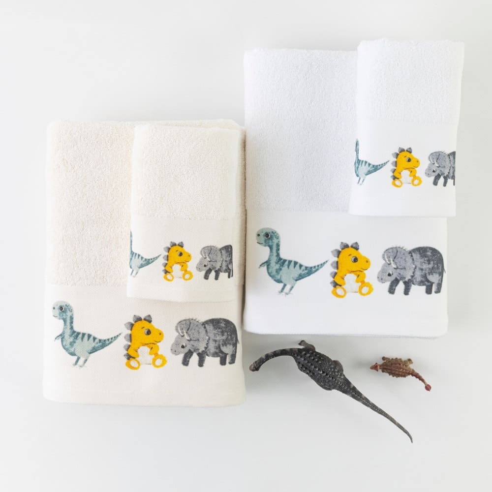 <p>Σετ πετσέτες 2 τεμαχίων, μπάνιου και χειρός, από ύφασμα φροτέ πενιέ, 100% βαμβακερό, μονόχρωμο, λευκό, με ψηφιακή εκτύπωση, σχέδιο δεινόσαυροι.Διατίθεται σε 2 χρώματα.</p>