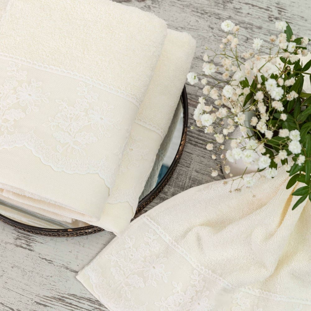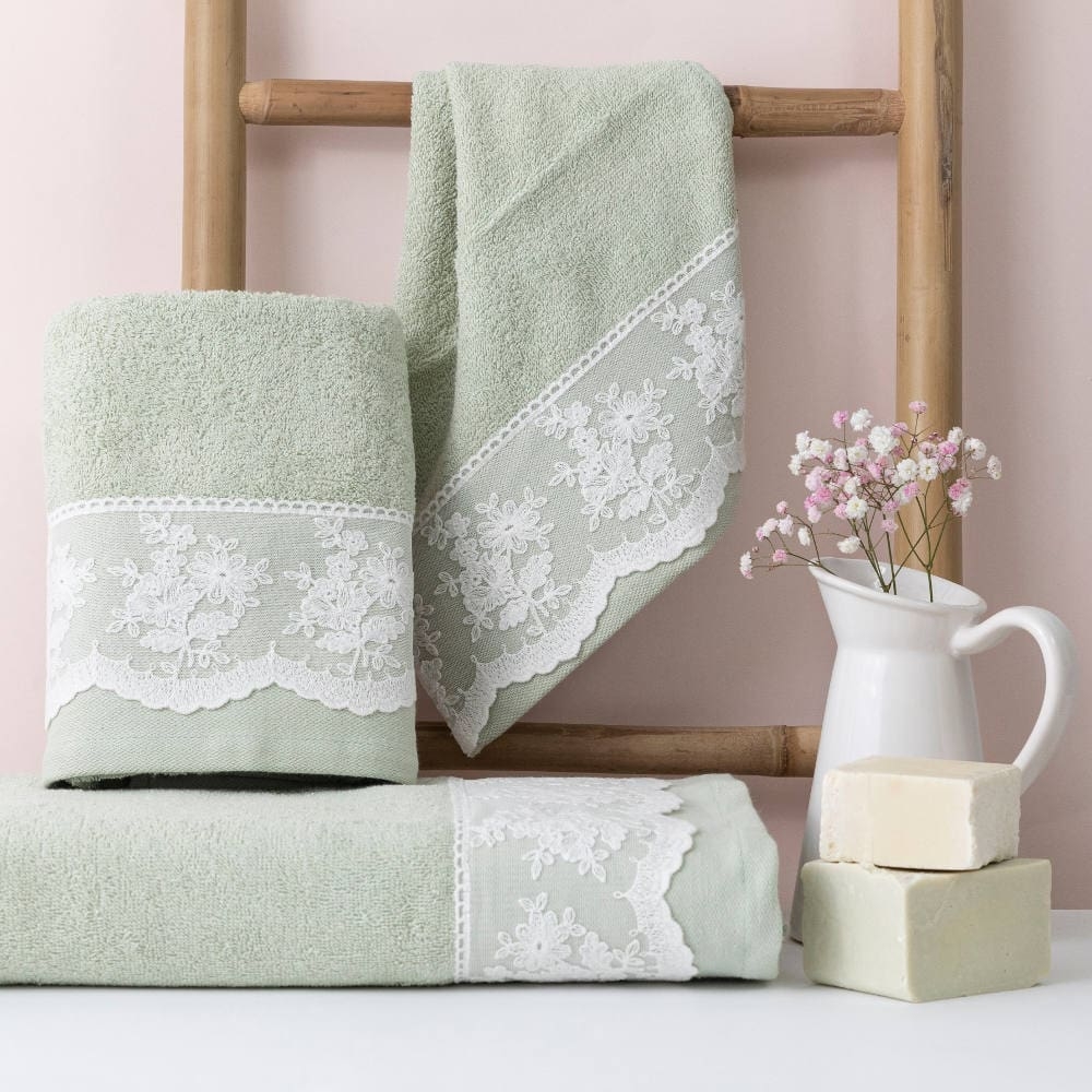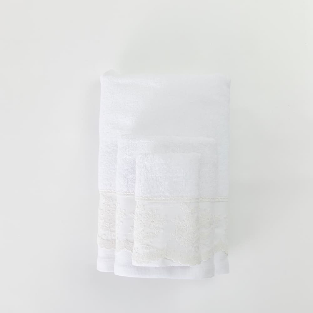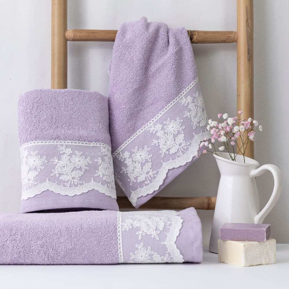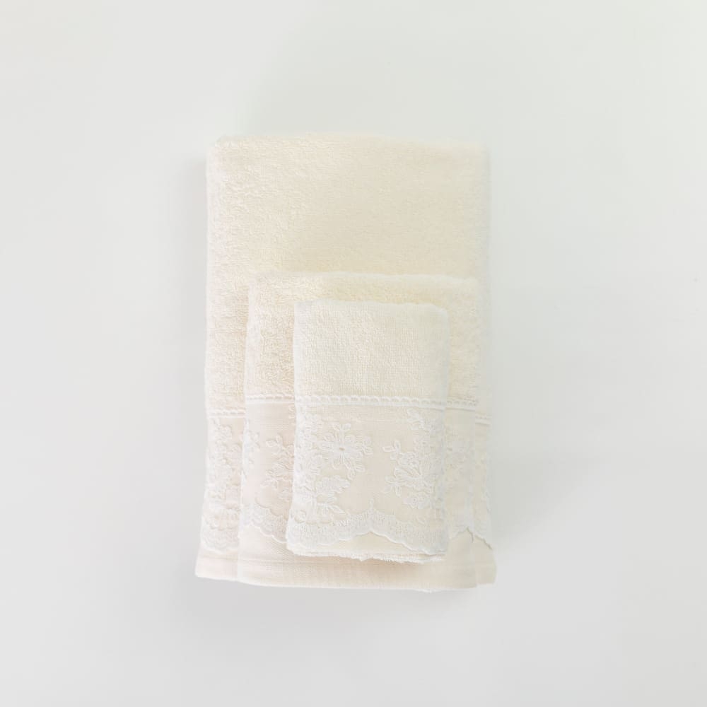 <p>Σετ πετσέτες 3 τεμαχίων, μπάνιου, προσώπου και χειρός, από ύφασμα φροτέ, πενιέ, 100% βαμβακερό, με διακοσμητική δαντέλα. Διατίθεται σε 2 χρώματα.</p>
