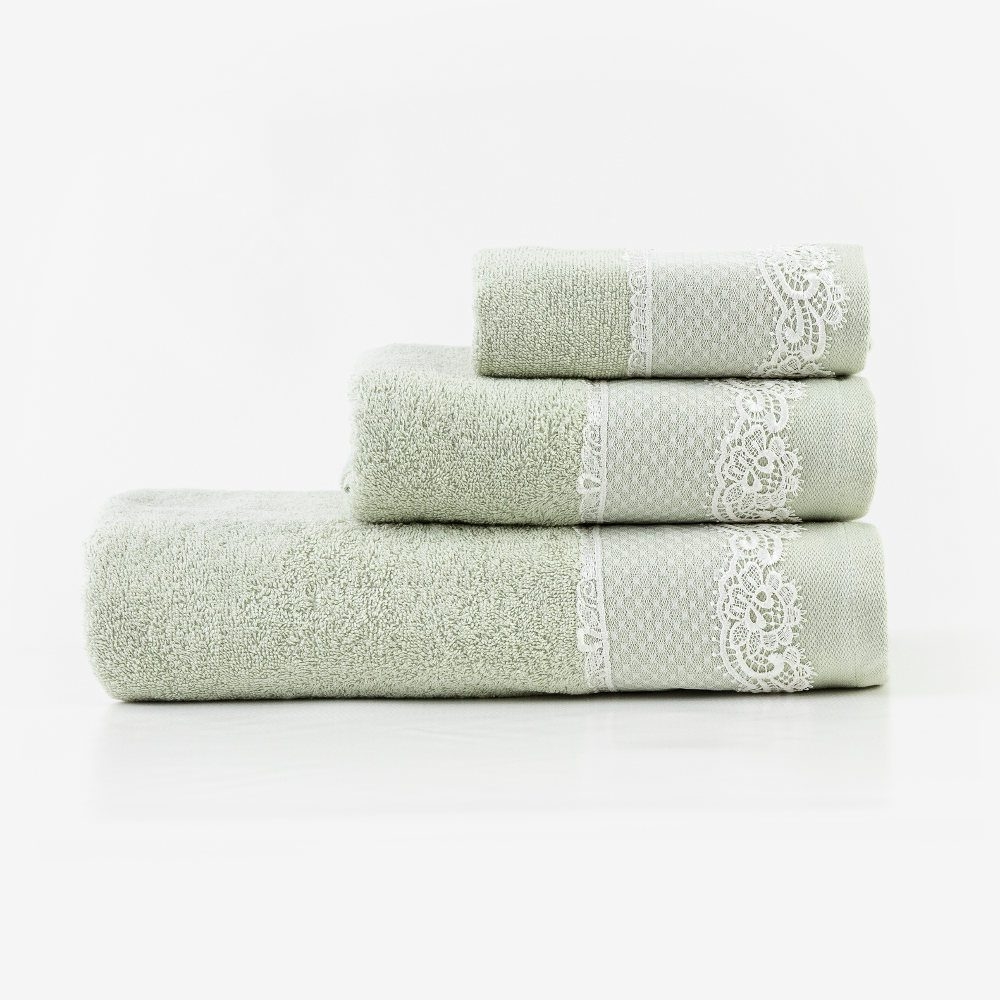 <p>Σετ πετσέτες 3 τεμαχίων, μπάνιου, προσώπου και χειρός, από ύφασμα φροτέ, πενιέ, 100% βαμβακερό, με διακοσμητική δαντέλα. Διατίθεται σε 5 χρώματα.</p>