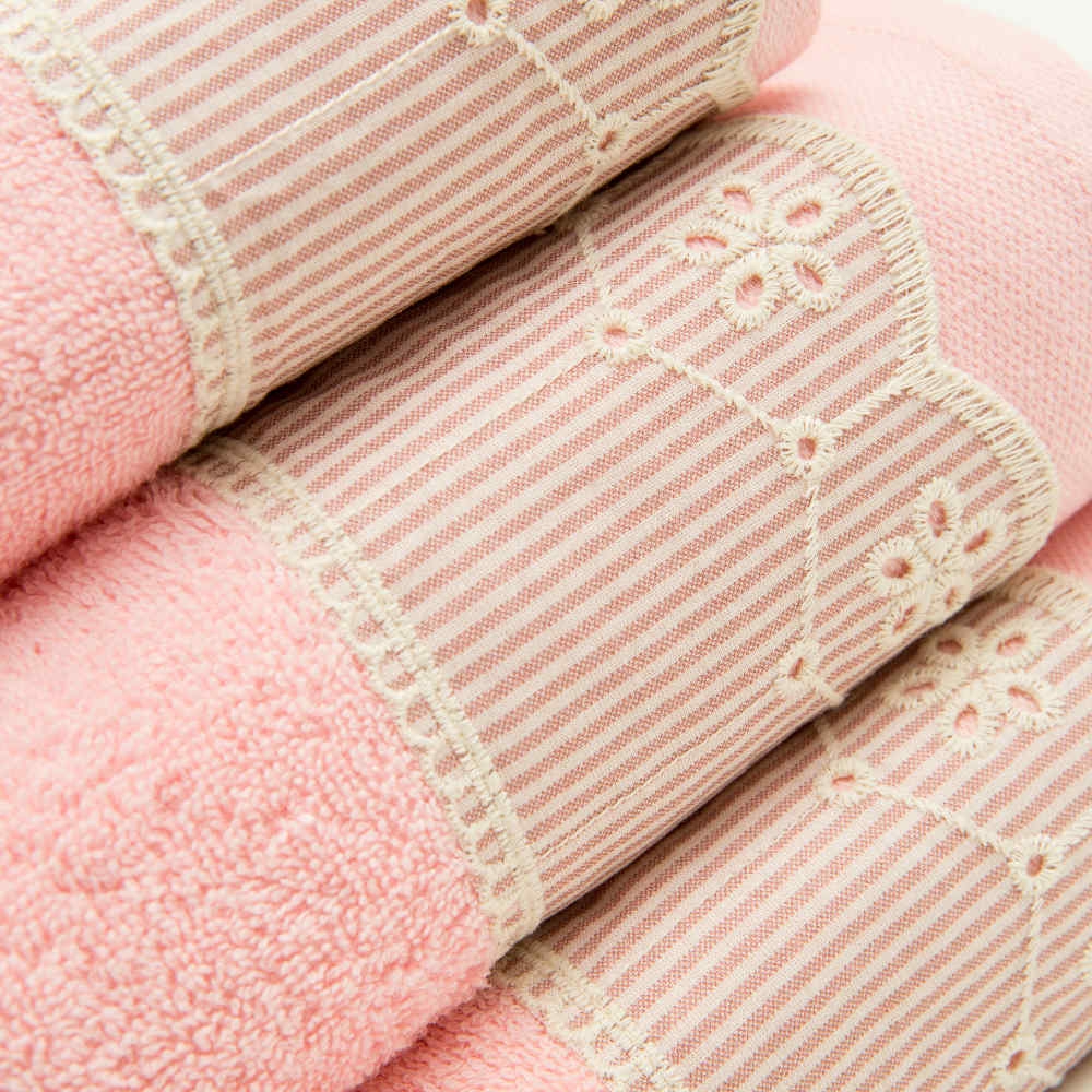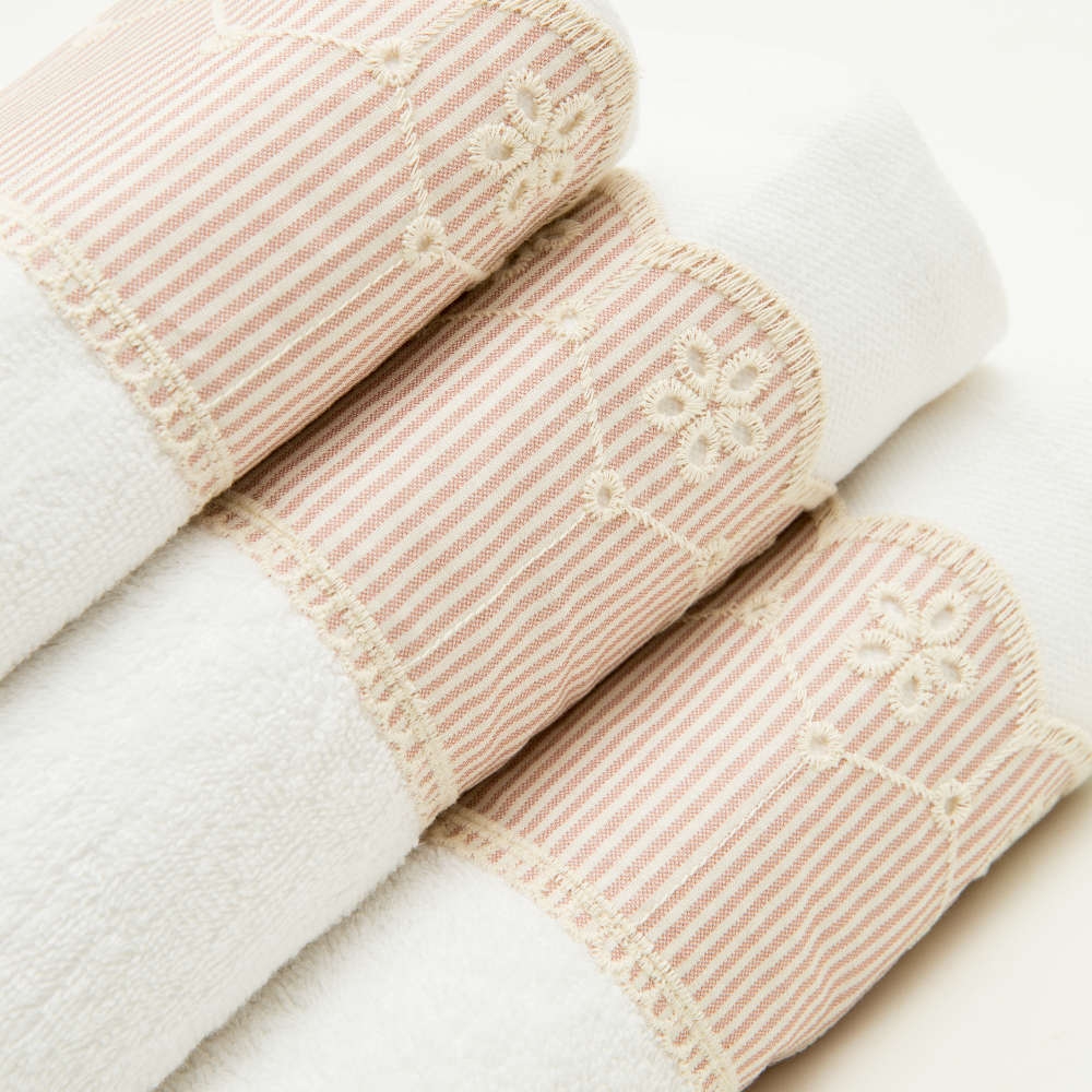 <p>Σετ πετσέτες 3 τεμαχίων, μπάνιου, προσώπου και χειρός, από ύφασμα φροτέ, πενιέ, 100% βαμβακερό, με διακοσμητική βαμβακερή δαντέλα.Διατίθεται σε 4 χρώματα.</p>