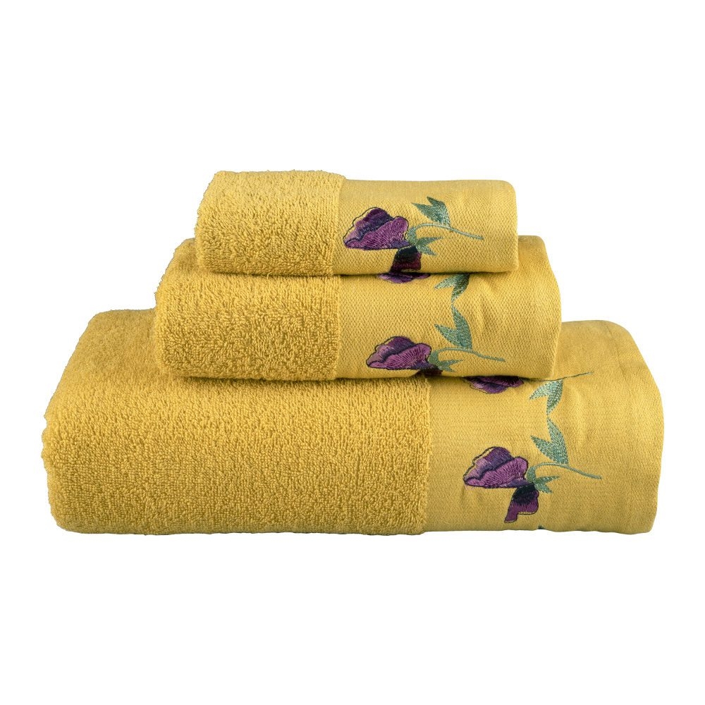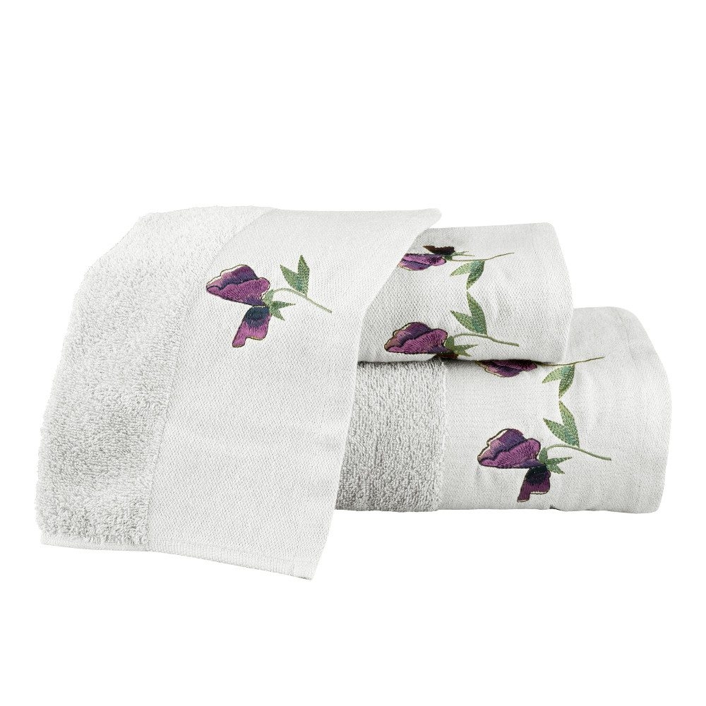 <p>Σετ πετσέτες 3 τεμαχίων, μπάνιου, προσώπου και χειρός, από ύφασμα φροτέ, πενιέ, 100% βαμβακερό, με κέντημα.Διατίθεται σε 4 χρώματα.</p>