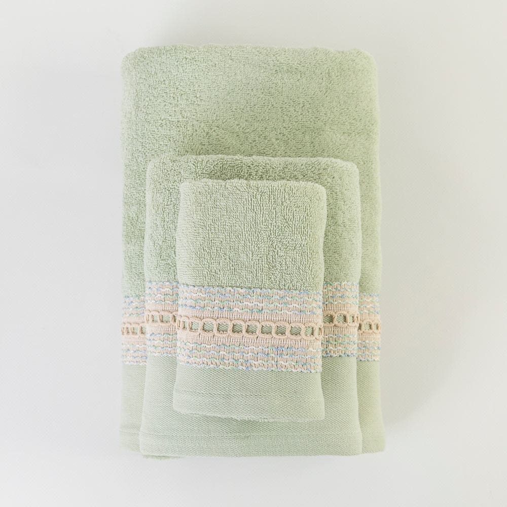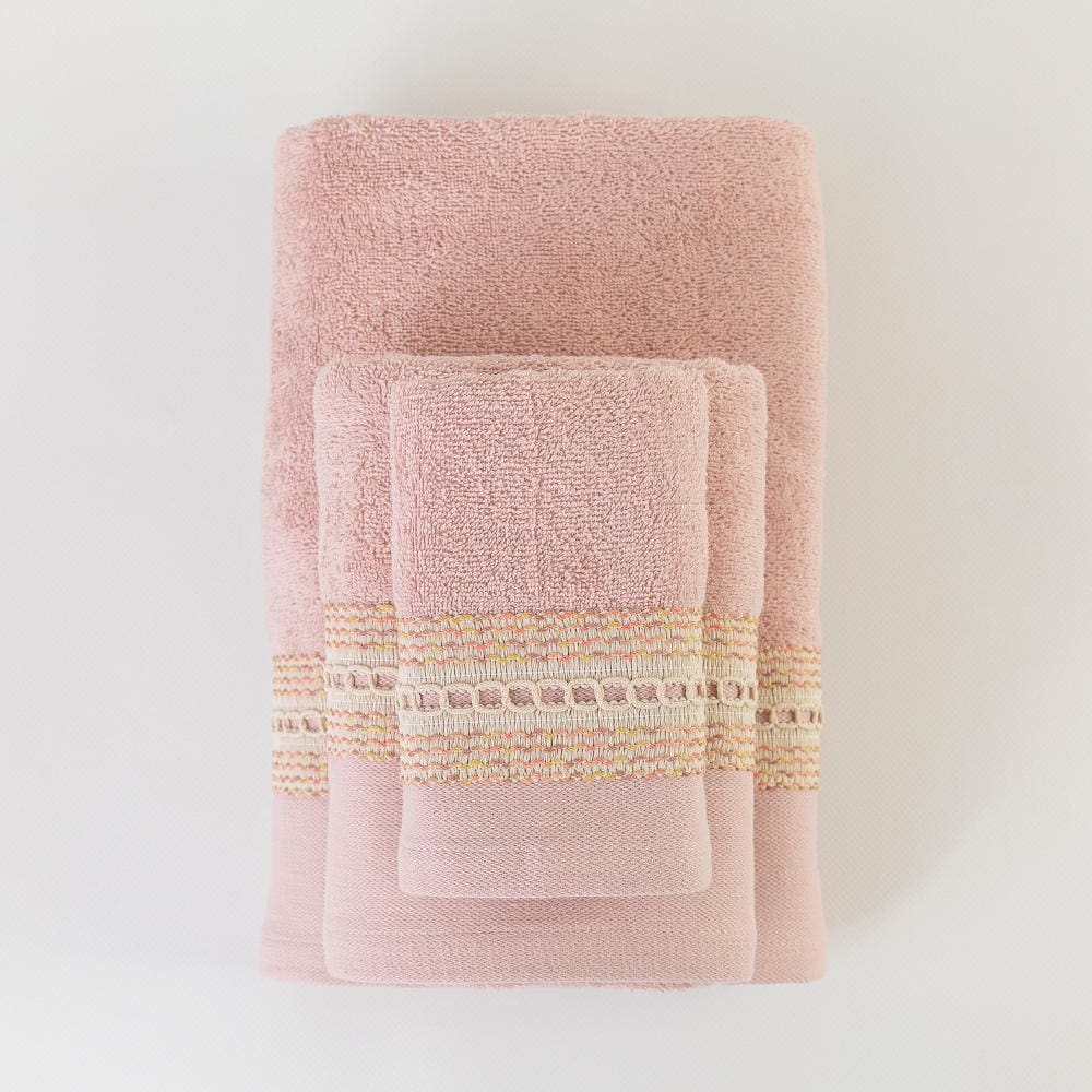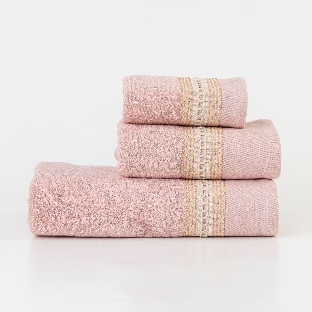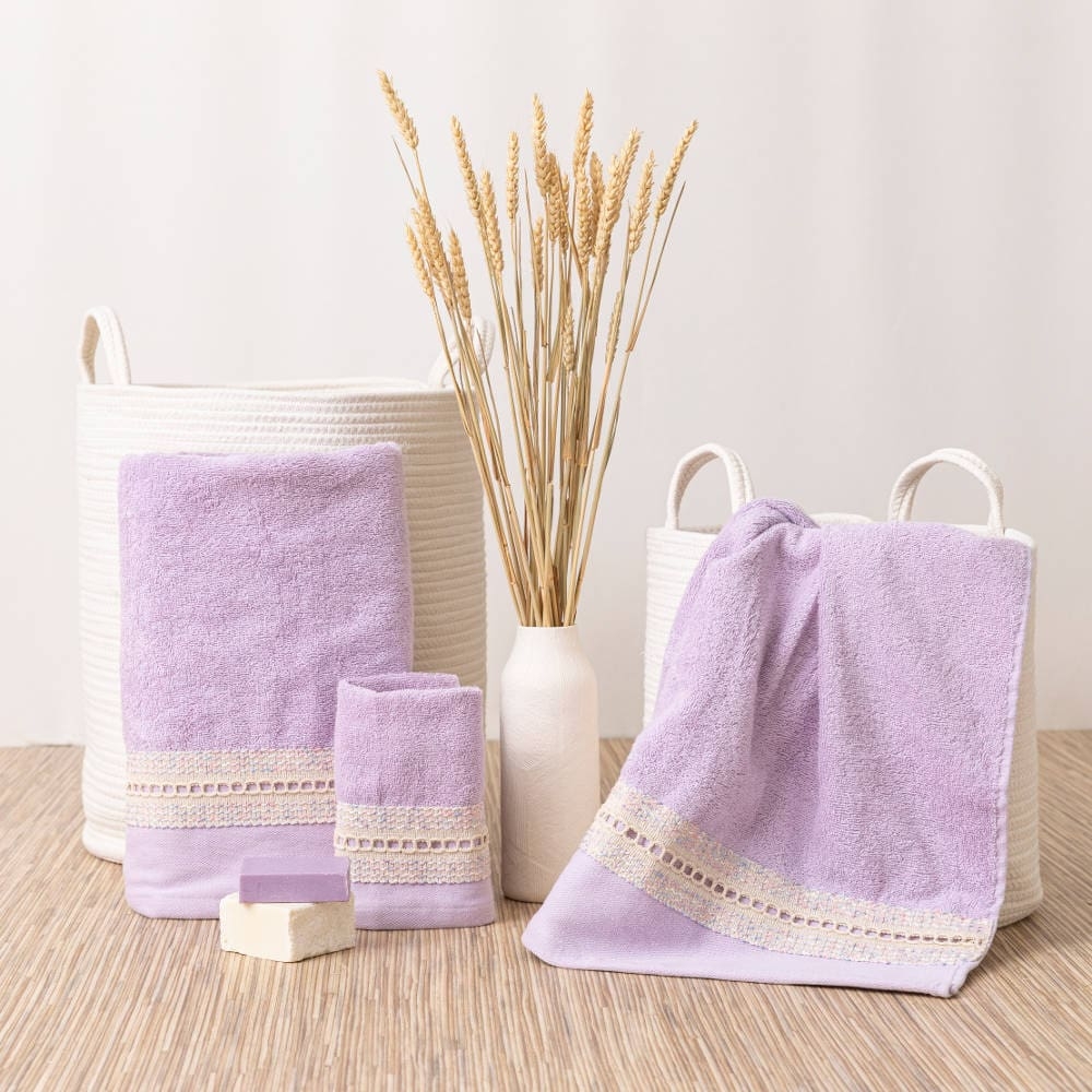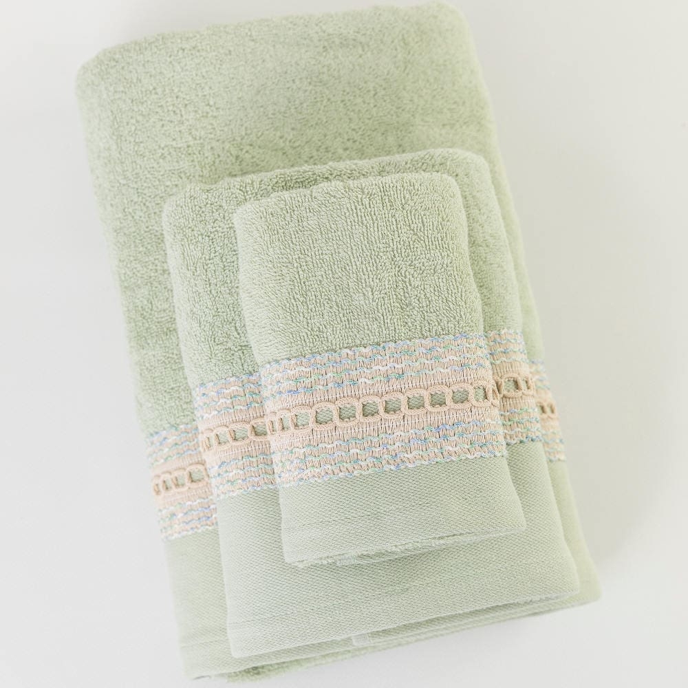 <p>Σετ πετσέτες 3 τεμαχίων, μπάνιου, προσώπου και χειρός, από ύφασμα φροτέ, πενιέ, 100% βαμβακερό, με διακοσμητική πλεχτή δαντέλα. Διατίθεται σε 5 χρώματα.</p>