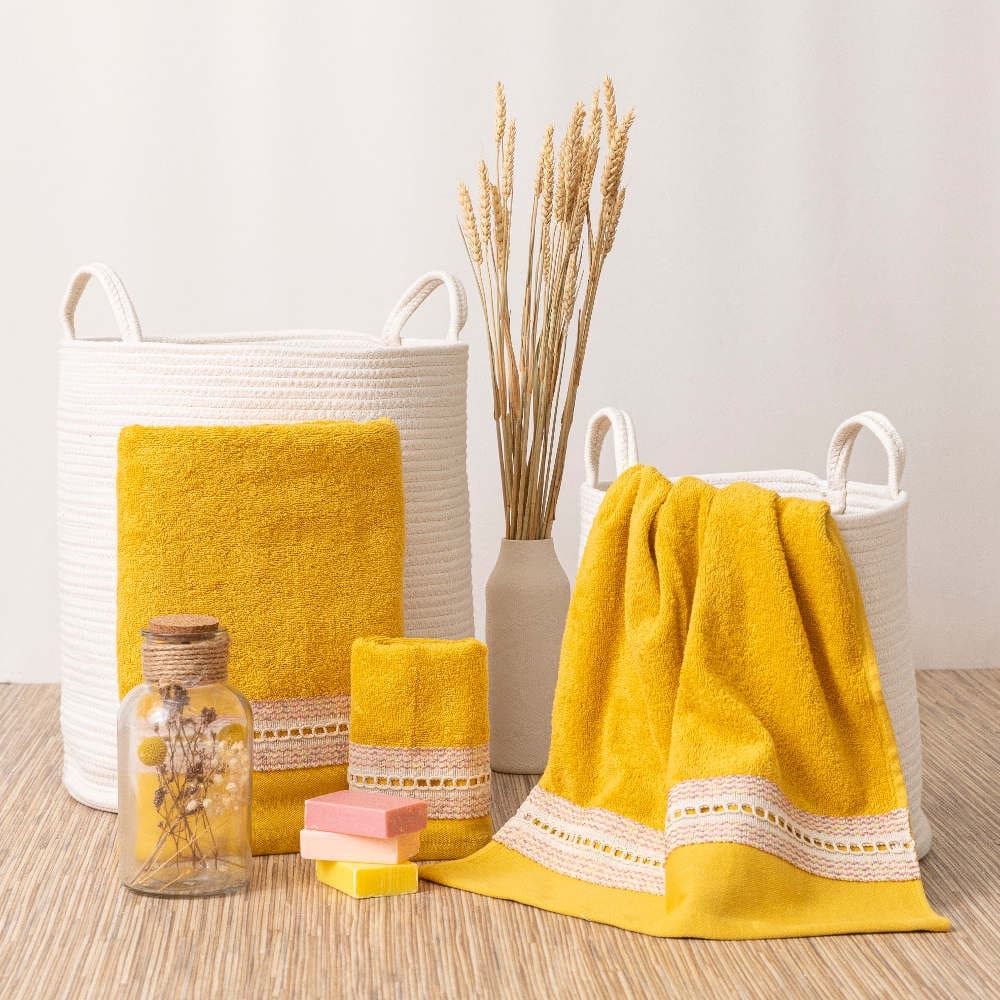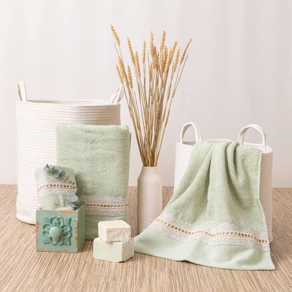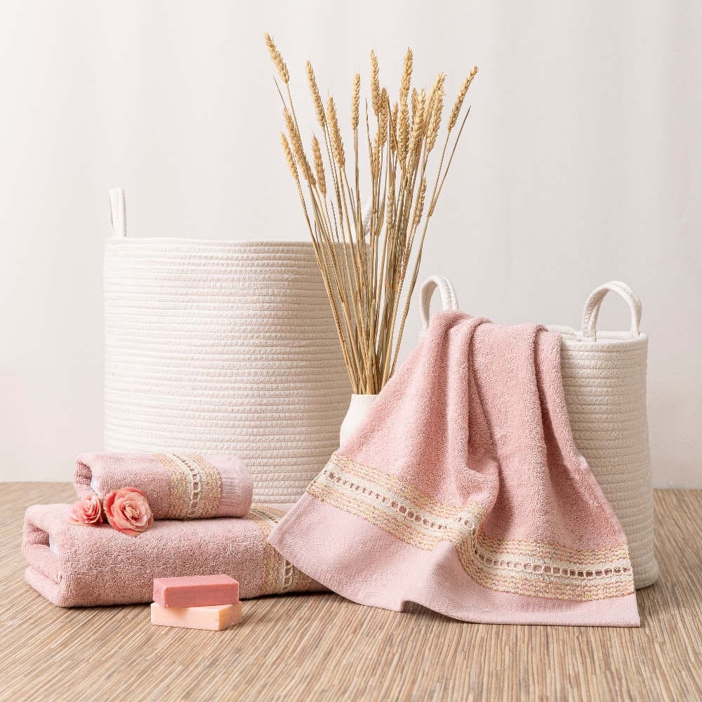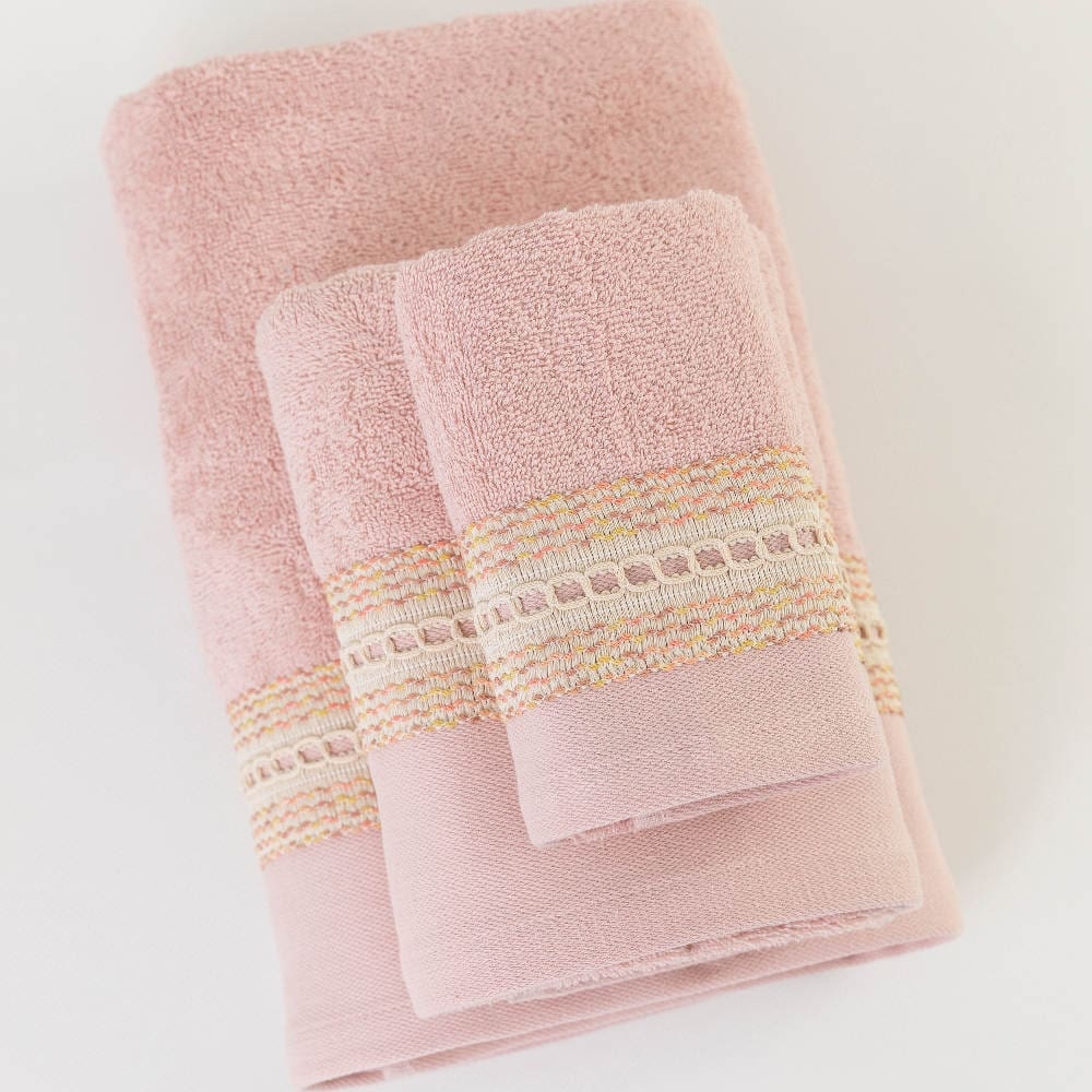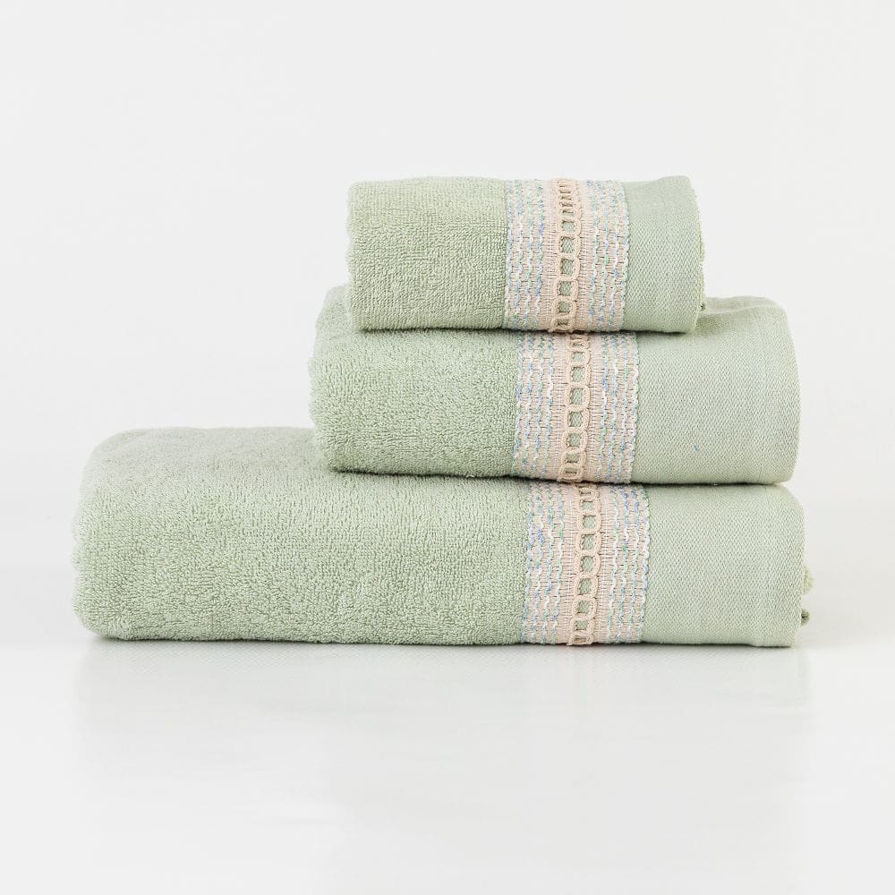 <p>Σετ πετσέτες 3 τεμαχίων, μπάνιου, προσώπου και χειρός, από ύφασμα φροτέ, πενιέ, 100% βαμβακερό, με διακοσμητική πλεχτή δαντέλα. Διατίθεται σε 5 χρώματα.</p>