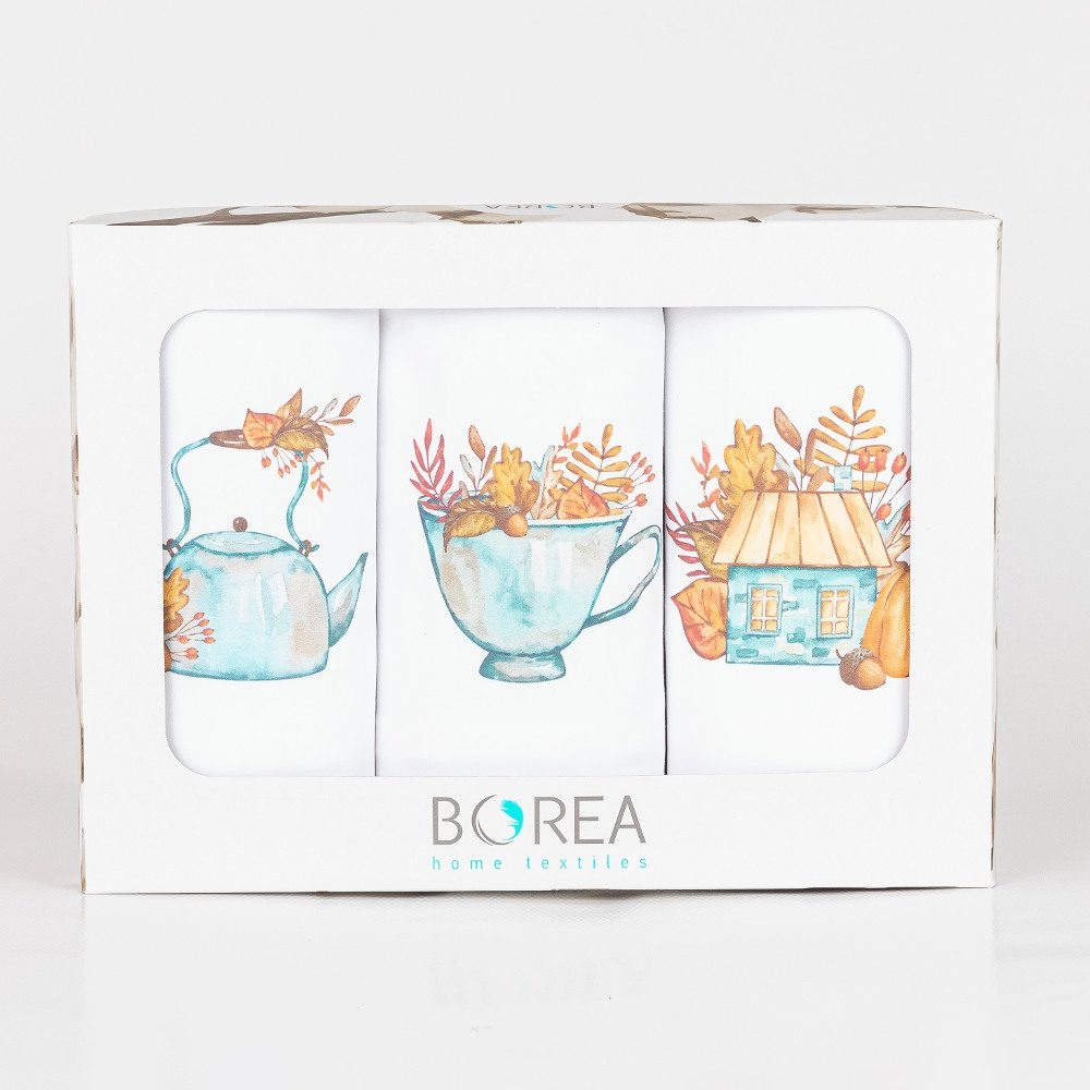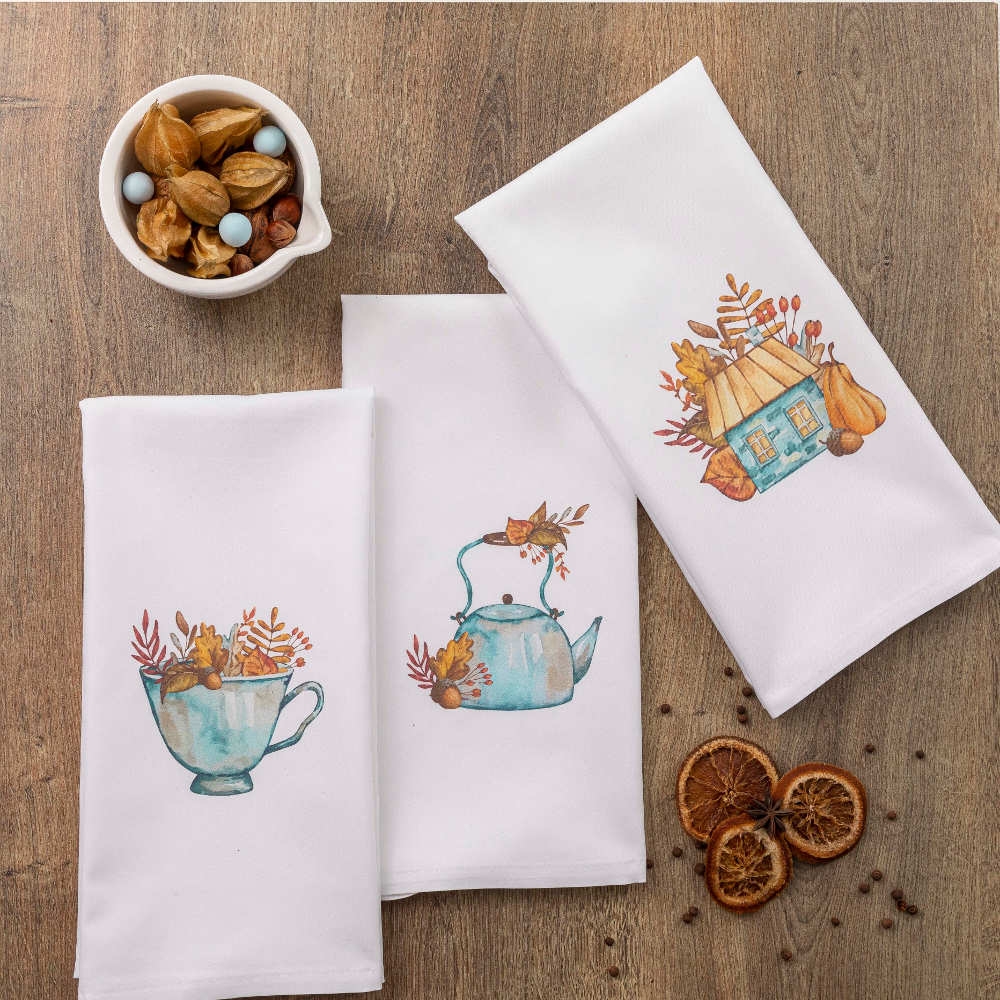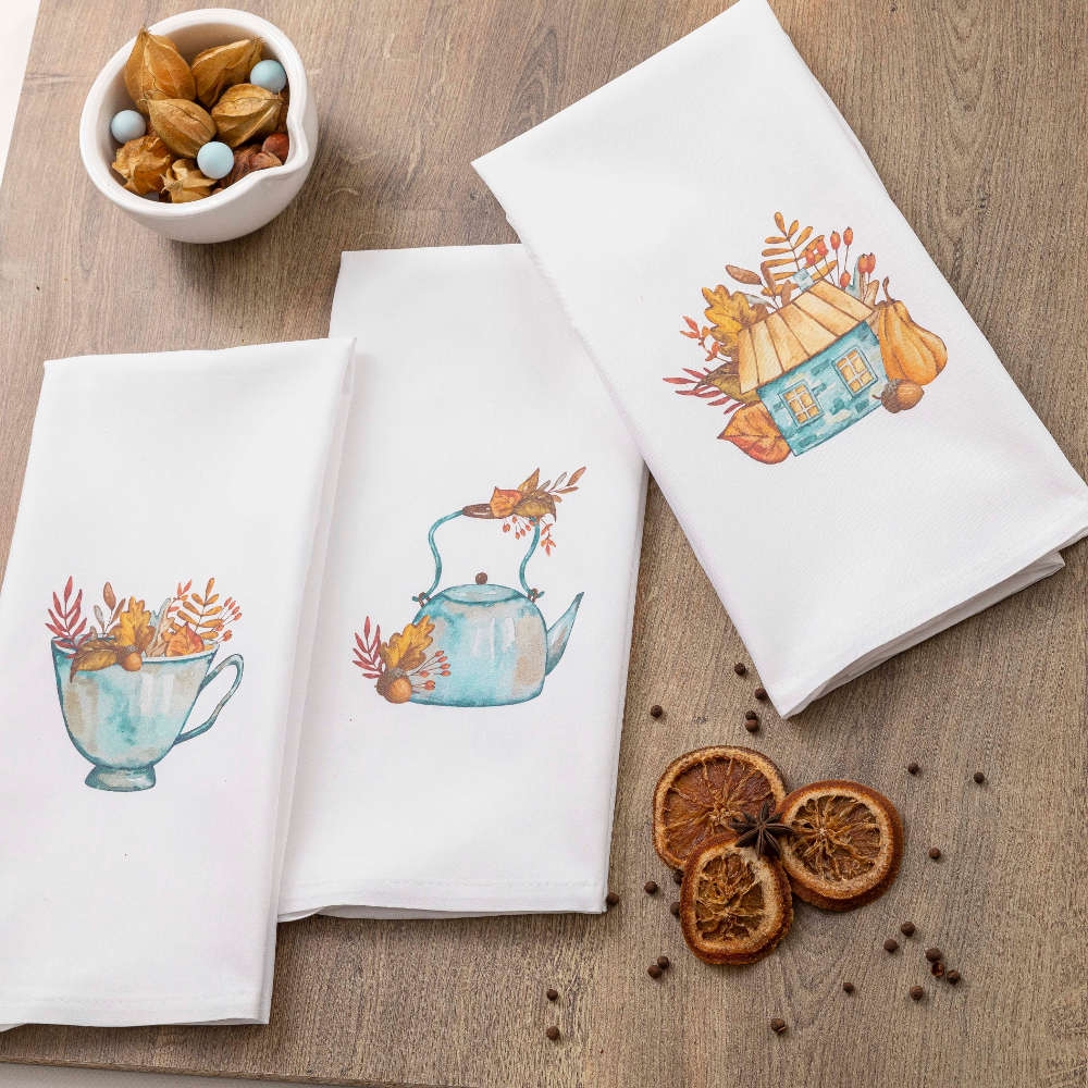 <p>Σετ από 3 ποτηρόπανα κουζίνας polycotton, 50% βαμβακερό-50% πολυέστερ, λευκό με ψηφιακή εκτύπωση σε κουτί συσκευασίας δώρου, σχέδιο είδη φθινόπωρο. Για σκούπισμα των πιάτων χωρίς χνούδι.</p>