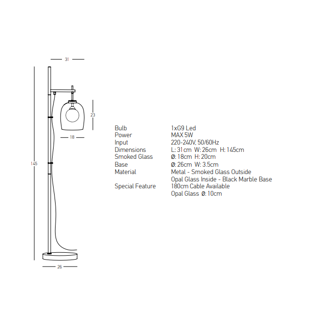 <p><span style="font-size:14px"><span style="font-family:verdana,geneva,sans-serif">Φωτιστικό δαπέδου <span style="color:rgb(33, 57, 59)">κατασκευασμένο από μέταλλο </span><span style="color:rgb(33, 57, 59)">σε μαύρη ματ απόχρωση και φιμέ γυαλί. Δέχεται λαμπτήρα G9 5watt. Συμβατότητα με Dimmer.</span></span></span></p>