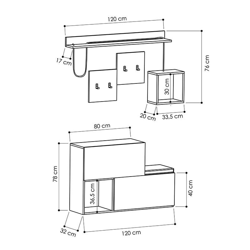 <li>Περιλαμβάνει δύο κλειστά ντουλάπια για παπούτσια, ράφια / κουτιά για διακοσμητικά, κρεμάστρες για ρούχα και ένα αναπαυτικό μαξιλάρι καθίσματος σε χρώμα μαύρο στην μία άκρη για χρήση ως σκαμπό.</li>