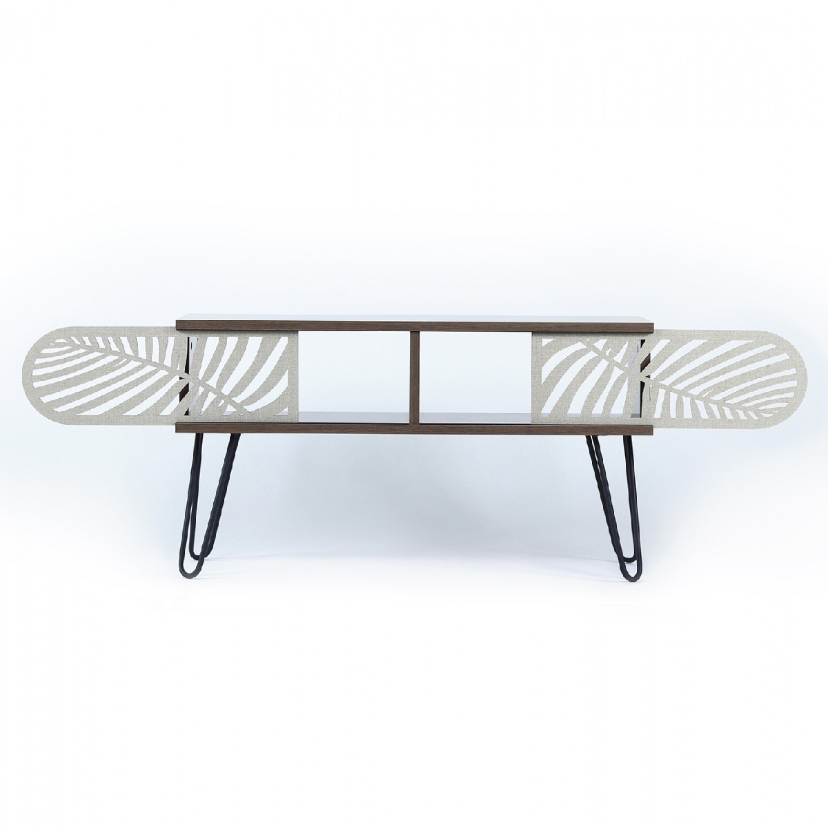 Έπιπλο τηλεόρασης με συρόμενα πορτάκια σε καρυδί απόχρωση με λεπτομέρειες σε εκρού και μαύρο χρώμα.<br />