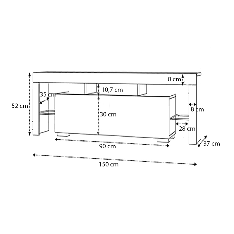 <li>Διαστάσεις: Μήκος 150 x Βάθος 37 x Ύψος 52 εκ.</li>