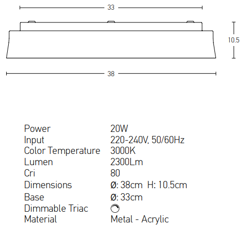 <p><span style="font-family:verdana,geneva,sans-serif"><span style="font-size:14px">Πλαφονιέρα/ Φωτιστικό οροφής Ø40 εκ, </span><span style="font-size:15px">η βάση του είναι κατασκευασμένη από μέταλλο και ακρυλικό. Καταναλώνει μόλις 20 Watt και αποδίδει 2300 Lumen (3000Κ) παρέχοντας άπλετο φώς στο χώρο σας.</span></span><span style="color:#000000; font-family:verdana,geneva,sans-serif; font-size:14px">Είναι συμβατό με Dimmer(Triac).</span></p>
