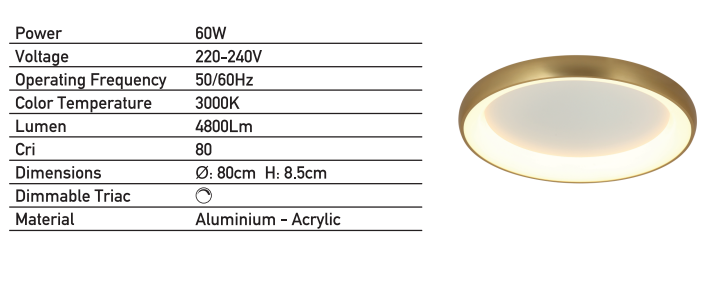 <p><span style="font-family:verdana,geneva,sans-serif"><span style="font-size:14px">Πλαφονιέρα/ Φωτιστικό οροφής Ø80 εκ, </span><span style="font-size:15px">η βάση του είναι κατασκευασμένη από μέταλλο και ακρυλικό. Καταναλώνει μόλις 60 Watt και αποδίδει 4800 Lumen (3000Κ) παρέχοντας άπλετο φώς στο χώρο σας.</span></span></p>