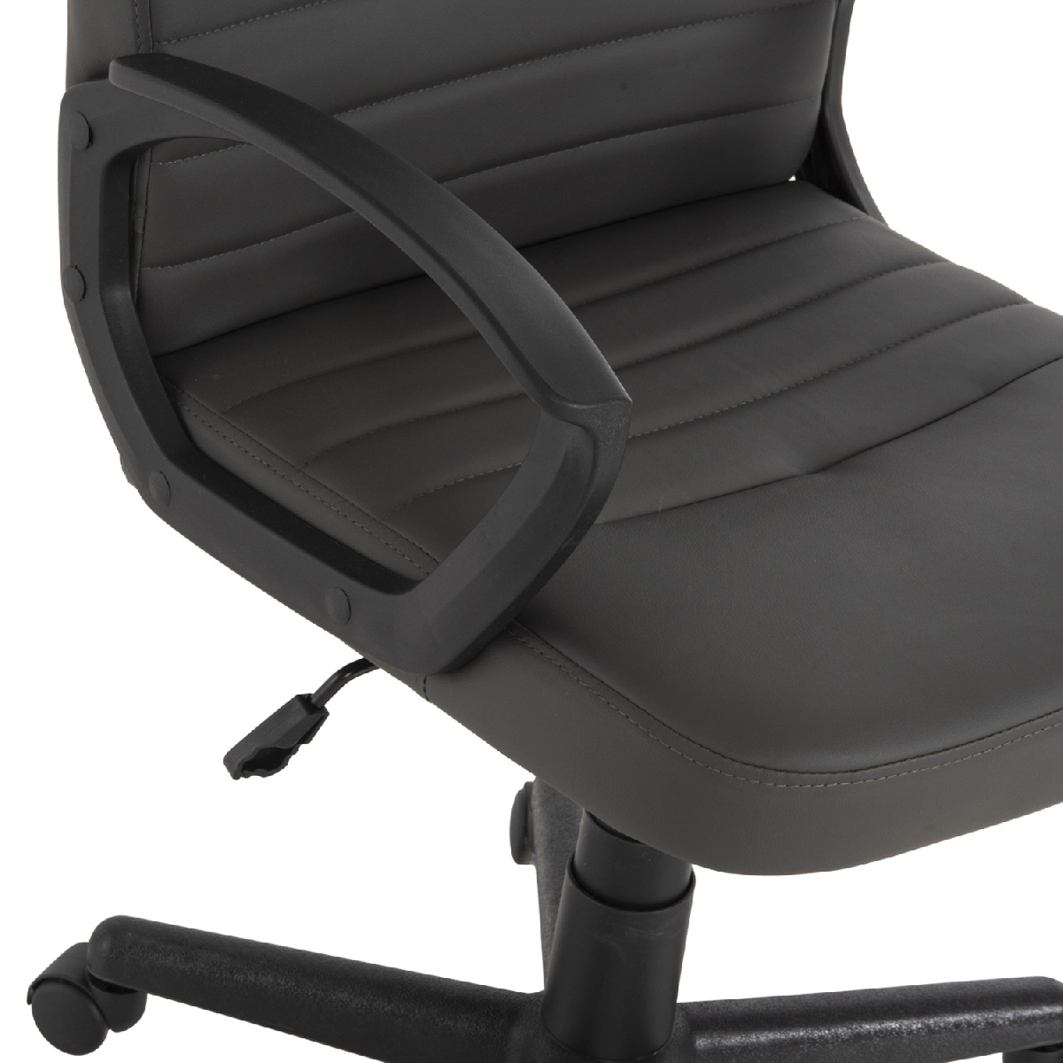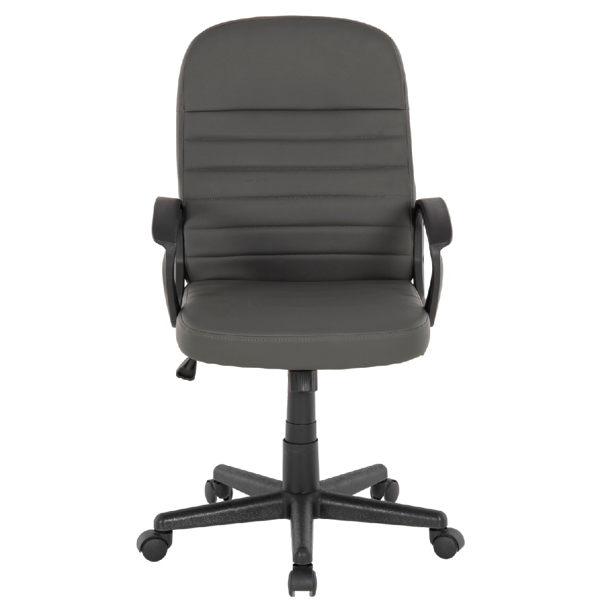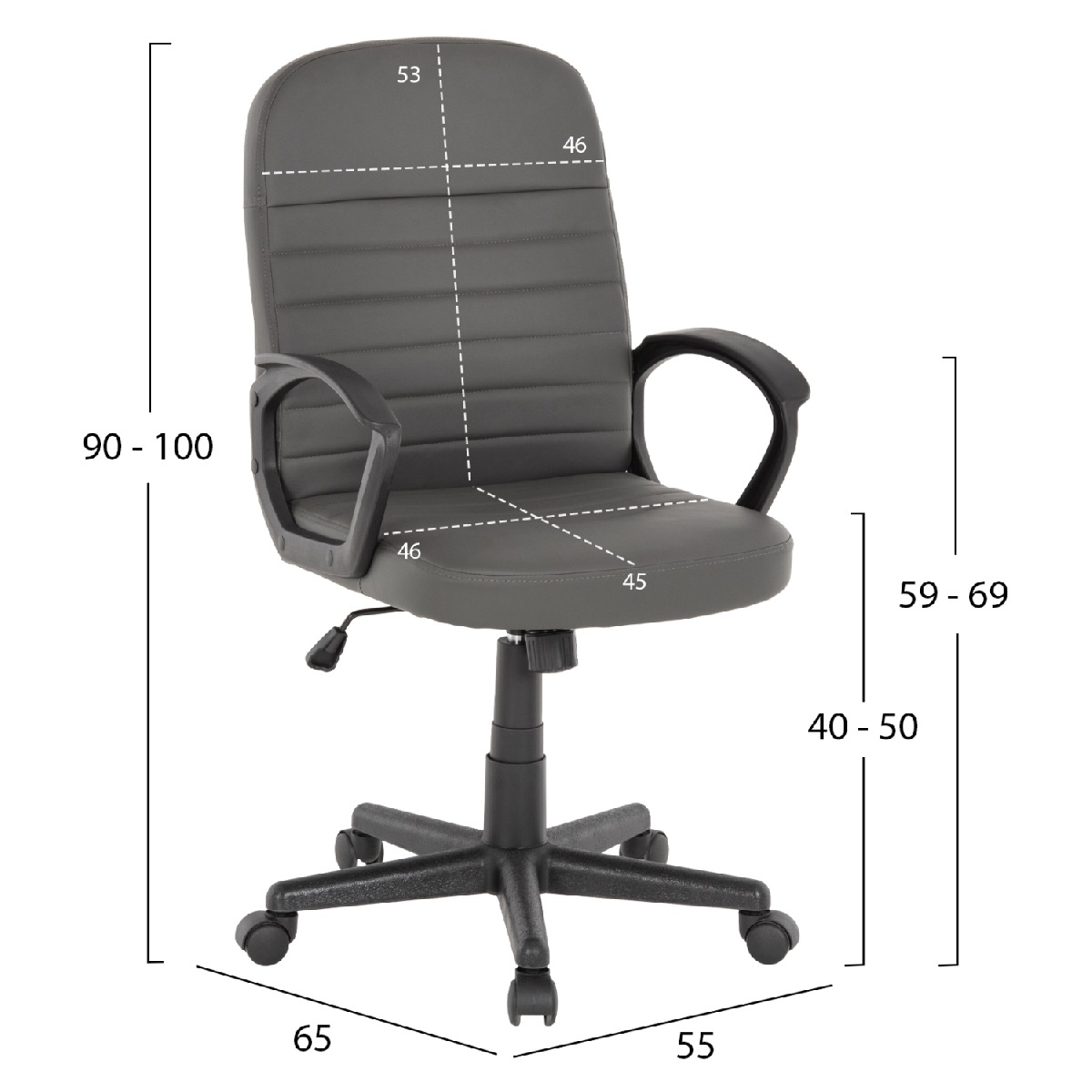 Η THEONI σε ΓΚΡΙ χρώμα είναι μια όμορφη καρέκλα γραφείου με ΜΑΥΡΑ μπράτσα από πολυπροπυλένιο. Η πλάτη είναι μεσαίου ύψους και με πλούσια στρώση από αφρώδη υλικά για άνεση κατά την χρήση, ενώ είναι επενδυμένη με υψηλής ποιότητας PU δέρμα, όπως επίσης και το αναπαυτικό κάθισμα. Η βάση είναι μαύρη σε σχήμα «αστέρι» και τα ροδάκια επίσης σε μαύρο χρώμα. <br />