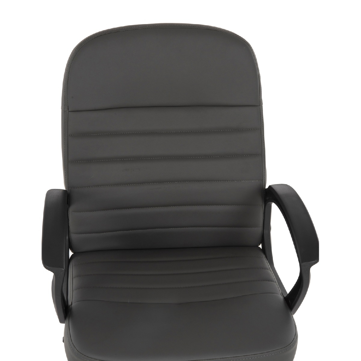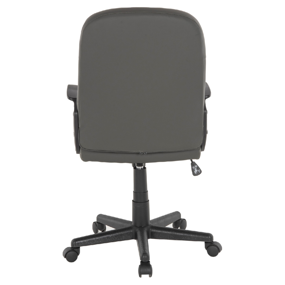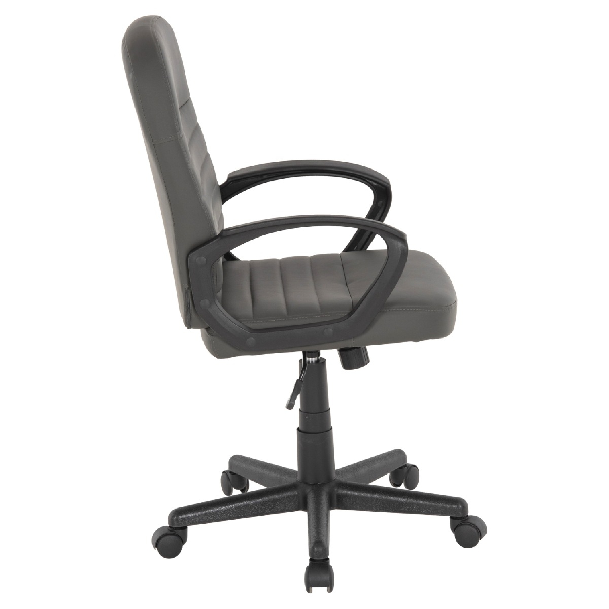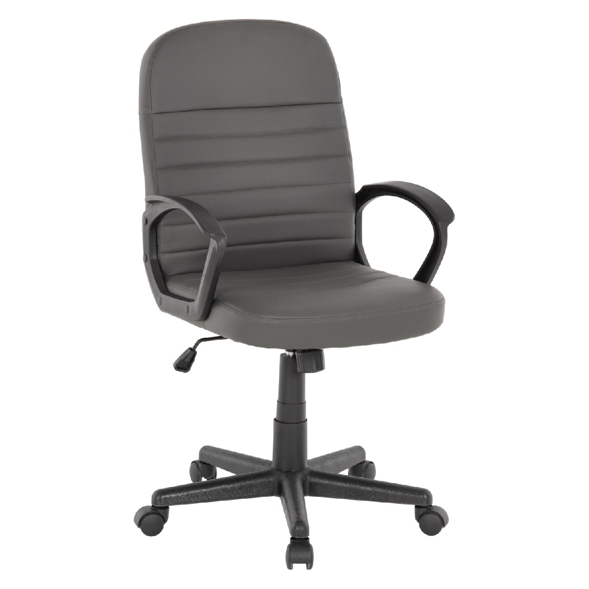 Η THEONI σε ΓΚΡΙ χρώμα είναι μια όμορφη καρέκλα γραφείου με ΜΑΥΡΑ μπράτσα από πολυπροπυλένιο. Η πλάτη είναι μεσαίου ύψους και με πλούσια στρώση από αφρώδη υλικά για άνεση κατά την χρήση, ενώ είναι επενδυμένη με υψηλής ποιότητας PU δέρμα, όπως επίσης και το αναπαυτικό κάθισμα. Η βάση είναι μαύρη σε σχήμα «αστέρι» και τα ροδάκια επίσης σε μαύρο χρώμα. <br />
