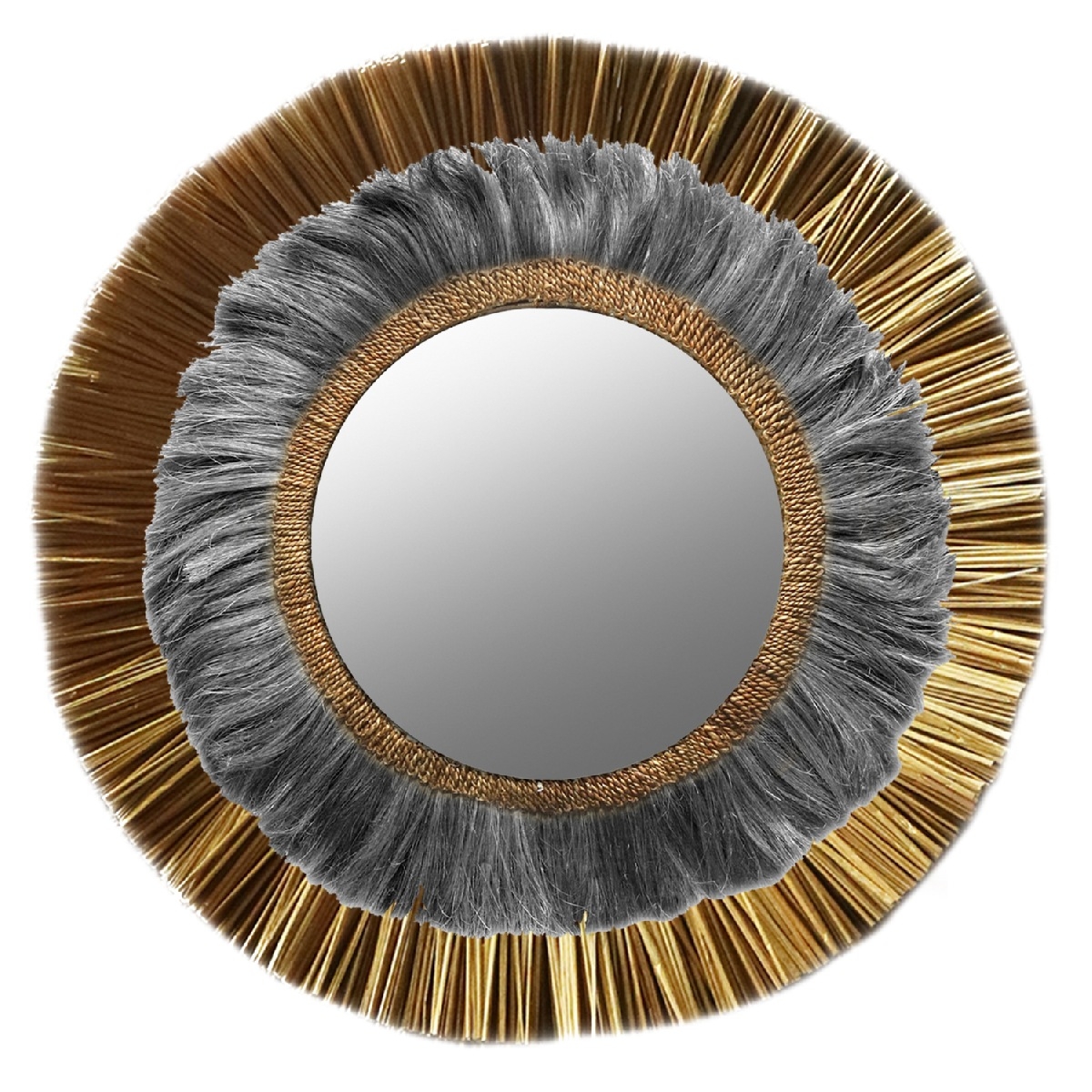 O στρογγυλός καθρέπτης ΗΜ7796 είναι πραγματικά ένα εντυπωσιακό κομμάτι στην διακόσμηση του χώρου σας! Το design του είναι όμορφο με πλαίσιο από 2 δακτυλίους με φυσικά υλικά. Ο μικρότερος δακτύλιος αποτελείται από ίνες κάνναβης Μανίλας σε black wash χρώμα, ενώ ο μεγαλύτερος δακτύλιος αποτελείται από Mendong Grass σε χρυσό χρώμα. Ο καθρέπτης στο κέντρο συμπληρώνει με όμορφο τρόπο αυτό το διακοσμητικό κυρίως κομμάτι.<br />