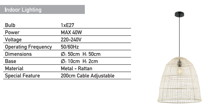 <p><span style="font-size:14px"><span style="font-family:verdana,geneva,sans-serif">Κρεμαστό φωτιστικό οροφής με μεταλλικό σκελετό καλυμμένο από φυσικό ρατάν που διαχέει το φως με φυσικό τρόπο.Η ανάρτηση του είναι ρυθμιζόμενη ώστε το φωτιστικό να προσαρμοστεί στο χώρο τοποθέτησής του.Δέχεται ένα λαμπτήρα με βάση E27 και μέγιστη ισχύ 40W.</span></span></p>