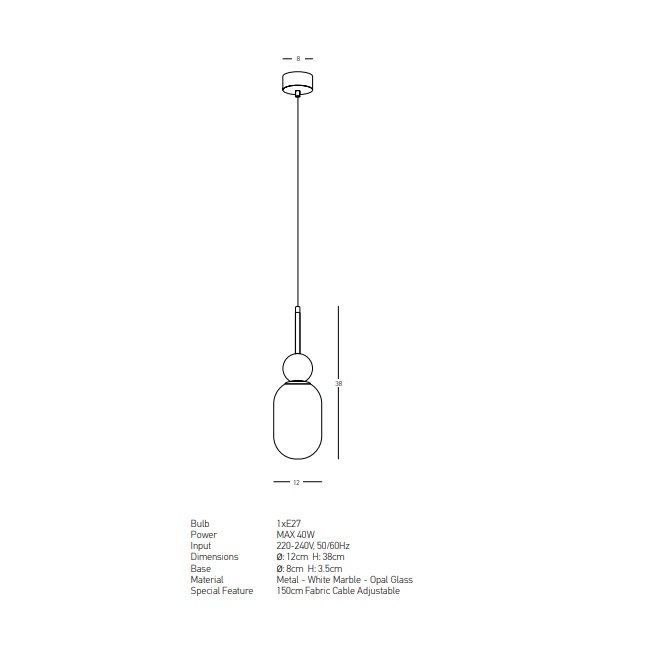 <p><span style="font-size:14px"><span style="font-family:verdana,geneva,sans-serif">Μονόφωτο κρεμαστό φωτιστικό οροφής <span style="color:rgb(33, 57, 59)">κατασκευασμένο από μέταλλο, μάρμαρο και λευκό οπάλ γυαλί .</span><br />