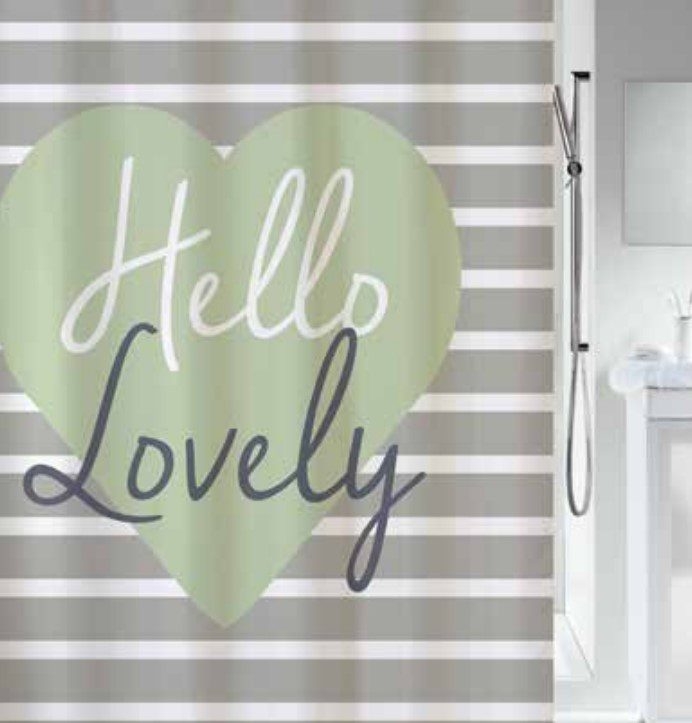 <p>Υφασμάτινη κουρτίνα μπάνιου με αδιαβροχοποίηση, σχέδιο καρδούλα “Hello Lovely”.</p>