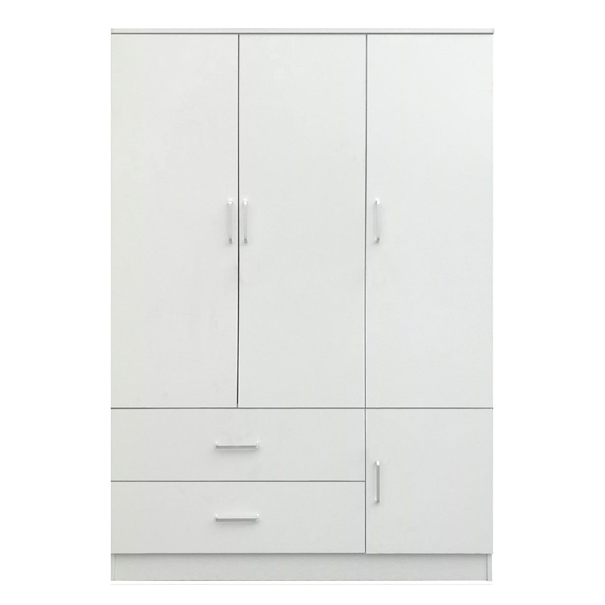 <p>Ντουλάπα ρούχων κατασκευασμένη από οικολογική μοριοσανίδα προσφέρει άφθονο αποθηκευτικό χώρο για την καλύτερη οργάνωση του ρουχισμού. Φέρει δύο πόρτες με έναν ενιαίο χώρο με ράγα για το κρέμασμα των ρούχων σας ενώ εξωτερικά από κάτω υπάρχουν δύο μεγάλα συρτάρια. Στα δεξιά φέρει δύο επιπλέον πόρτες που περιέχουν τέσσερα μεγάλα ράφια. Μπορεί να χρησιμοποιηθεί για οικιακή και επαγγελματική χρήση (ξενοδοχεία, ξενώνες, airbnb κτλ.).</p>