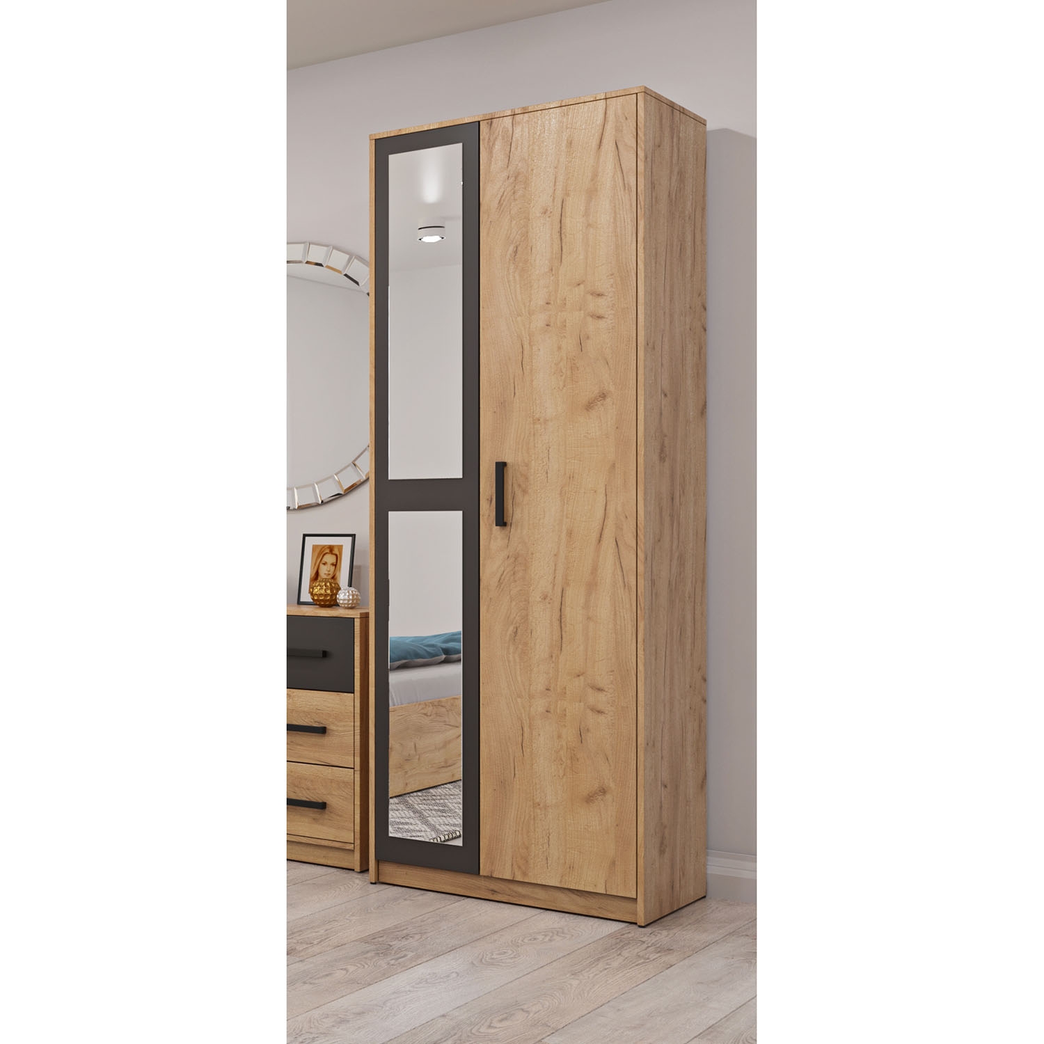 Η ντουλάπα είναι από τα σημαντικότερα έπιπλα του σπιτιού, για τον λόγο αυτό, χρειάζεται να σκεφτείτε αρκετά για να επιλέξετε την κατάλληλη για τον χώρο σας, προκειμένου να τον διαμορφώσετε σύμφωνα τις ανάγκες σας.<br>.</p><br/><p><b>Χαρακτηριστικά</b><br/>Χρώμα: Χρυσός Δρύς,Γραφίτη<br/>Υλικό: Πάνελ Επενδεδυμένο (MF PB)<br/>Τύπος: Δίφυλλη<br/>Χαρακτηριστικό: Ανοιγόμενο<br/>Περισσότερα: Ευρωπαϊκής Κατασκευής</p><br/><p><br/>Διαστάσεις: 70x50x209cm</p><p><br/><a href='/products_pdf/alpha_GR-VIVAWARD.pdf' target='_blank'>Οδηγίες συναρμολόγησης</a></p>