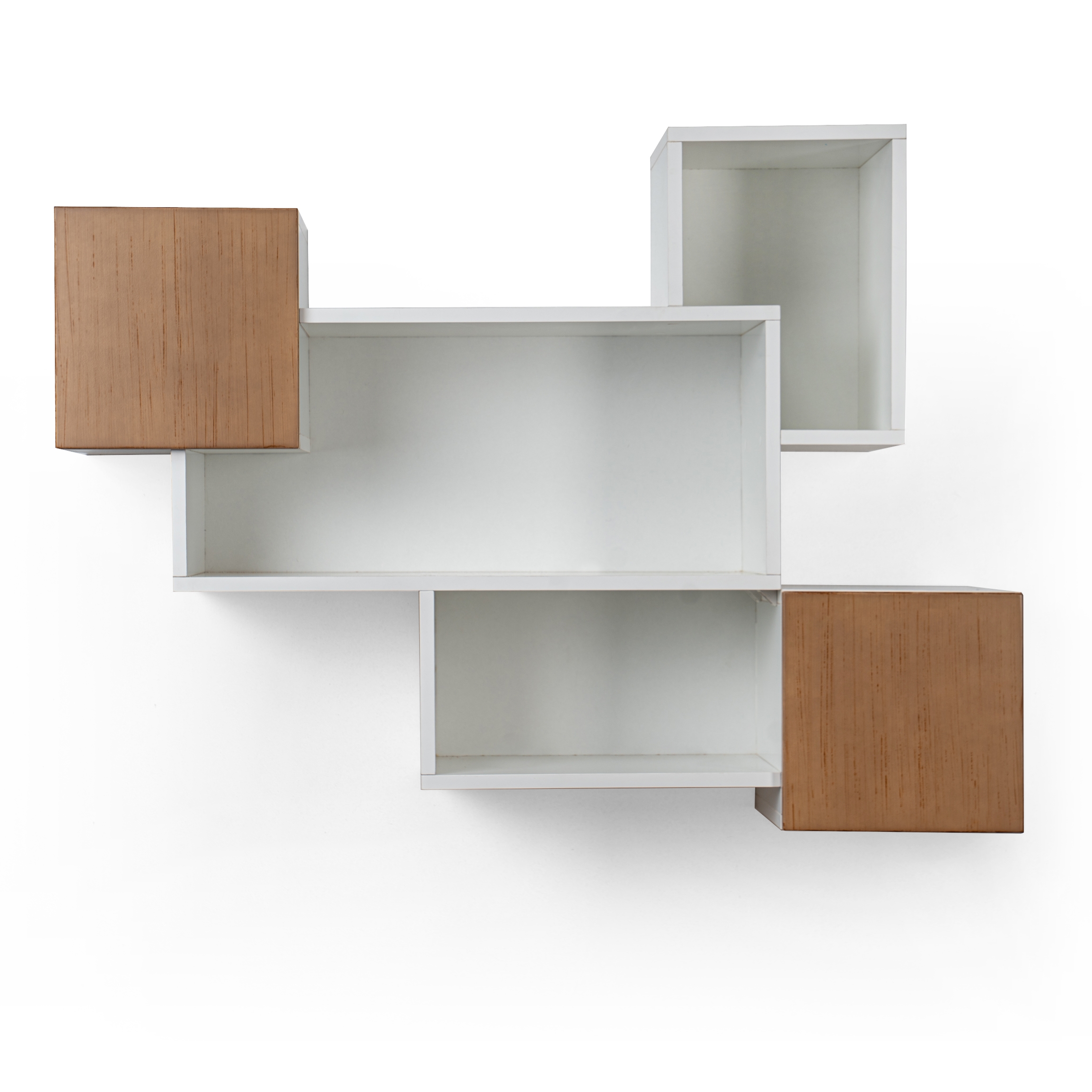 Μοντέρνα παιδική βιβλιοθήκη τοίχου. Κομψή στο χώρο με ασύμμετρα ανοιχτά κουτιά και ντουλάπια σε φυσικές αποχρώσεις.