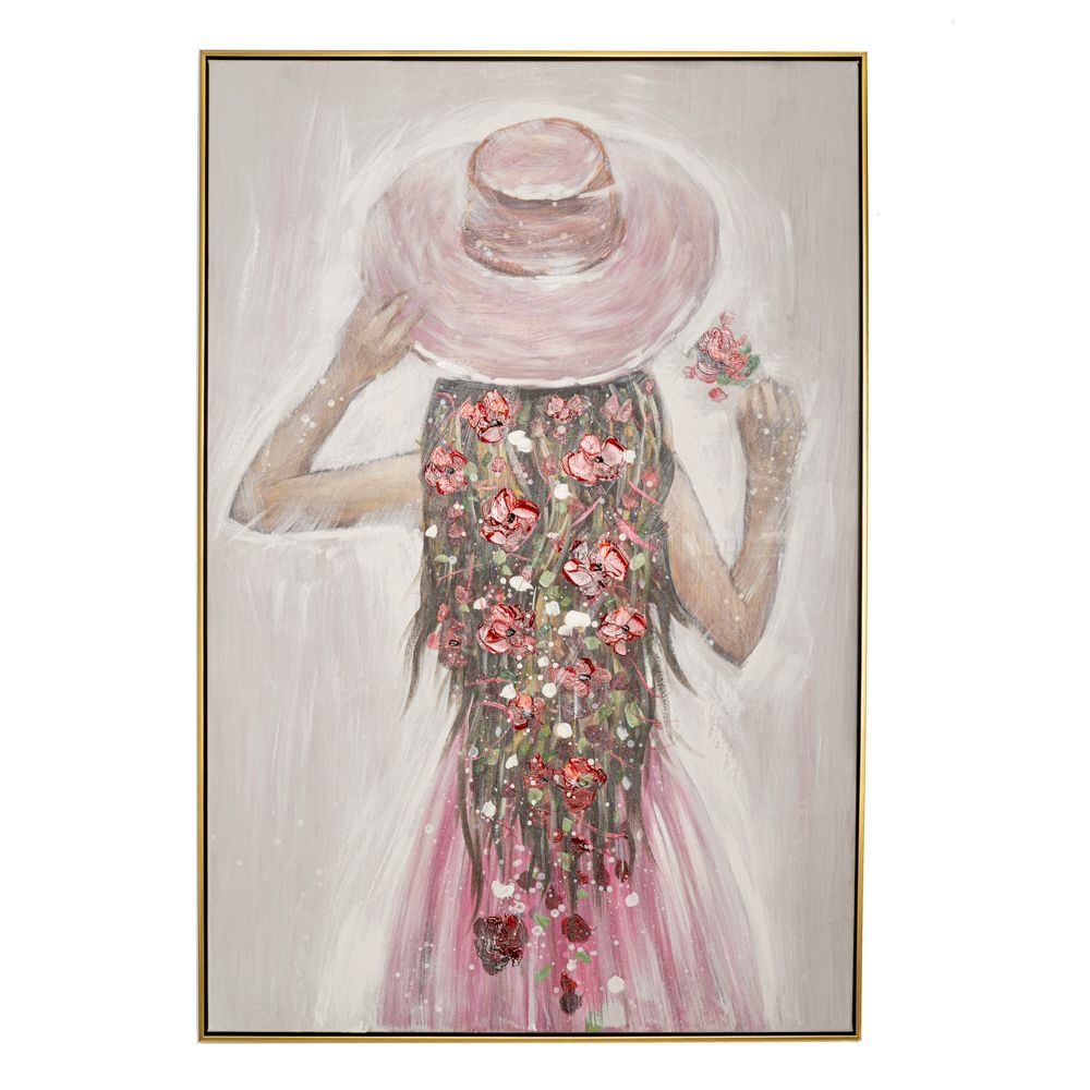 Πίνακας ελαιογραφίας πάνω σε τυπωμένο καμβά με φιγούρα γυναίκας σε ροζ φόρεμα και λουλούδια στα μαλλιά 82x122 εκ