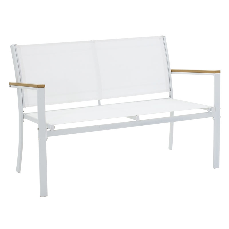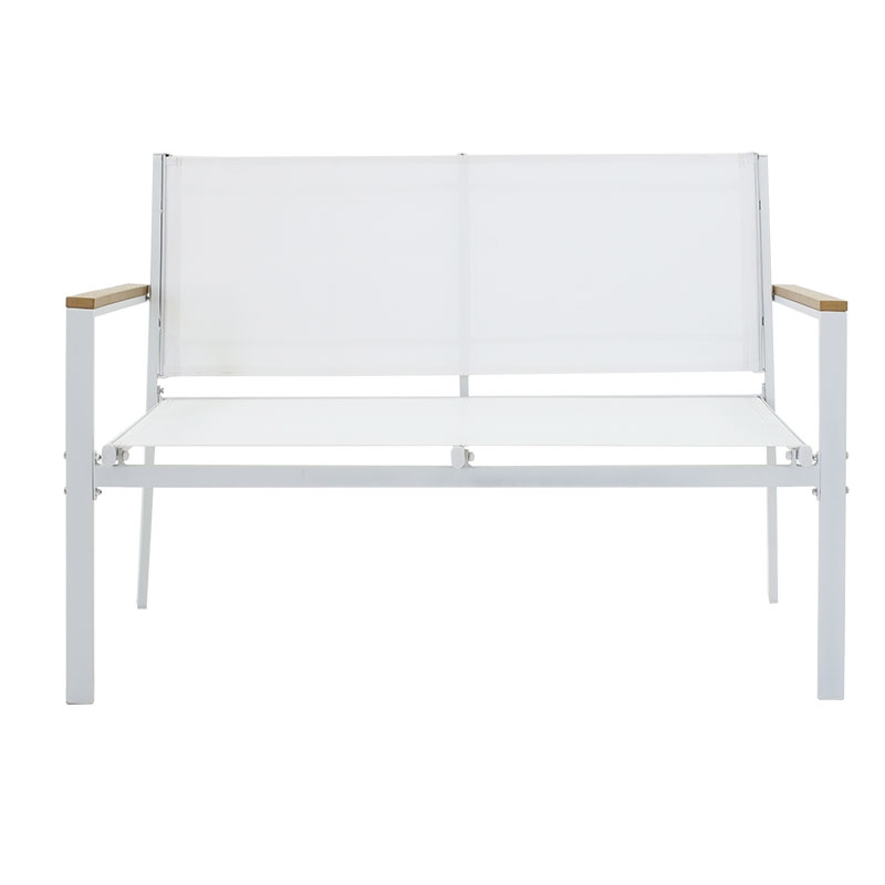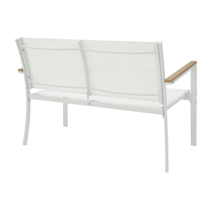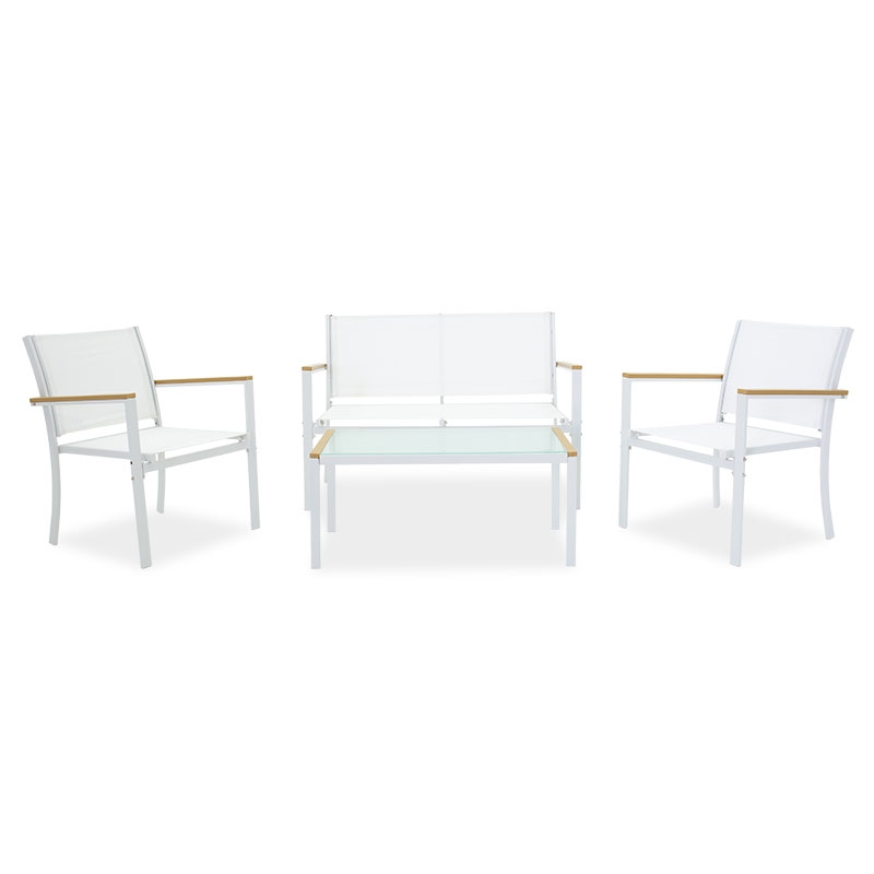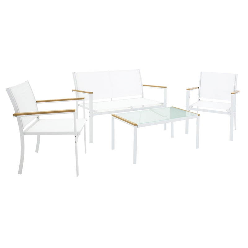 <li>Ένα διθέσιο καναπέ, δύο πολυθρόνες με σκελετό από ανθεκτικό μέταλλο, συνθετικό ξύλο σε μπράτσα και άκρες τραπεζιού και επένδυση textilene σε χρώμα λευκό - φυσικό.</li>