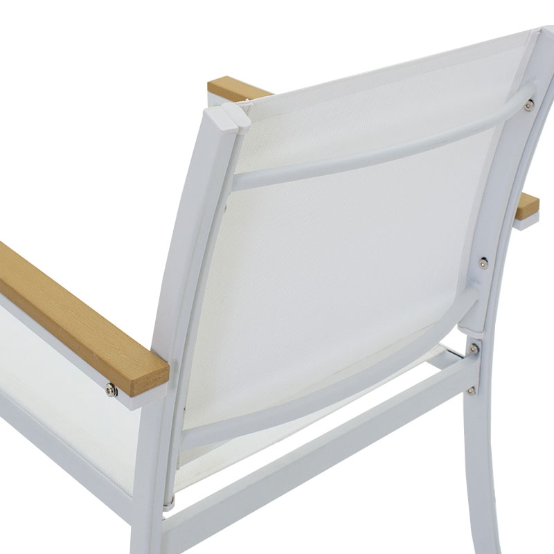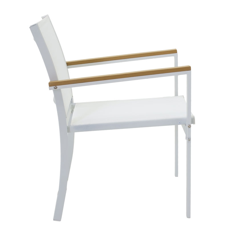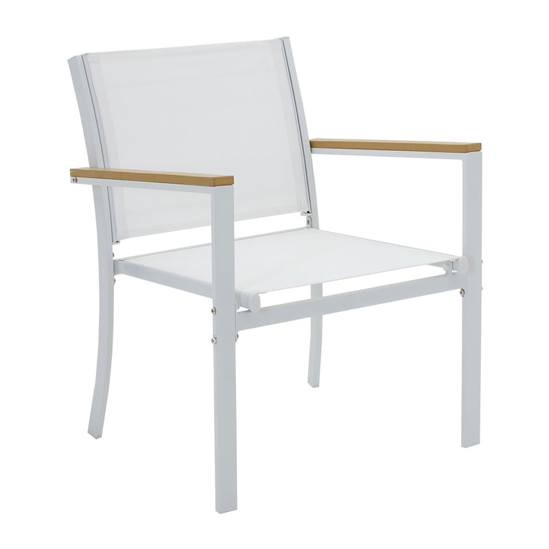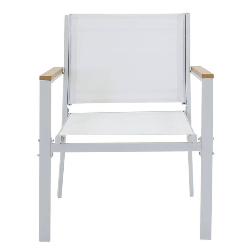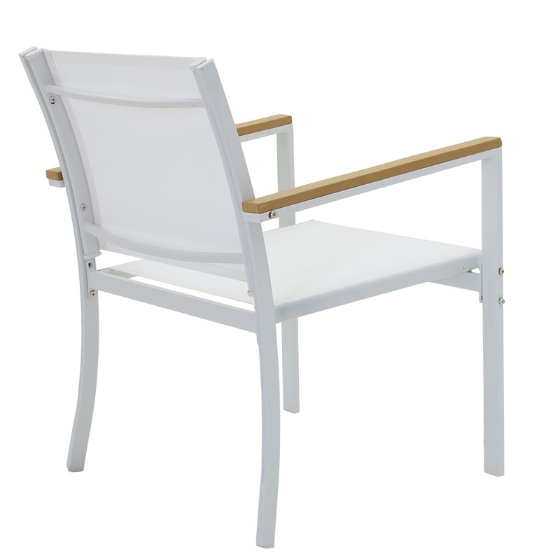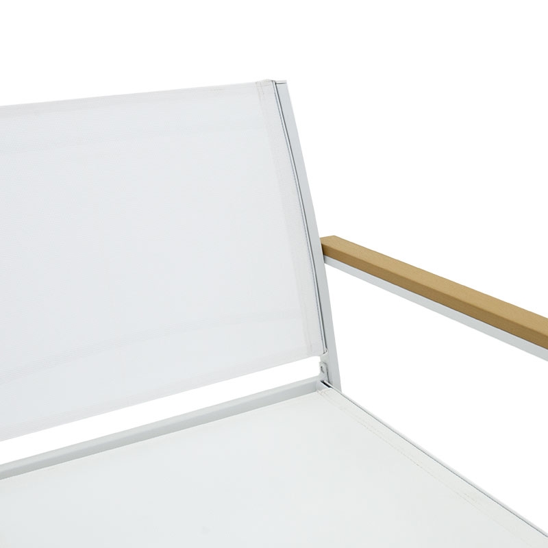 <li>Ένα διθέσιο καναπέ, δύο πολυθρόνες με σκελετό από ανθεκτικό μέταλλο, συνθετικό ξύλο σε μπράτσα και άκρες τραπεζιού και επένδυση textilene σε χρώμα λευκό - φυσικό.</li>