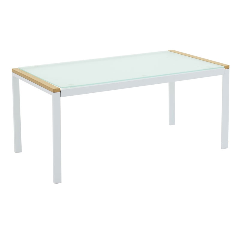 <li>Ένα γυάλινο τραπέζι: Με σταθερό σκελετό από υψηλής ποιότητας μέταλλο, προσφέρεται σε λευκό χρώμα με φυσικό στα μπράτσα των καθισμάτων και στις άκρες του τραπεζιού.</li>