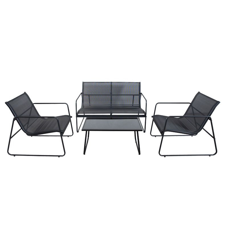 <li>Ένα διθέσιο καναπέ και δύο πολυθρόνες με μαύρο σκελετό από ανθεκτικό μέταλλο 19*0.8mm. 42*14mm και επένδυση από εξαιρετικής ποιότητας textilene 27*15*0.8mm σε χρώμα μαύρο.</li>