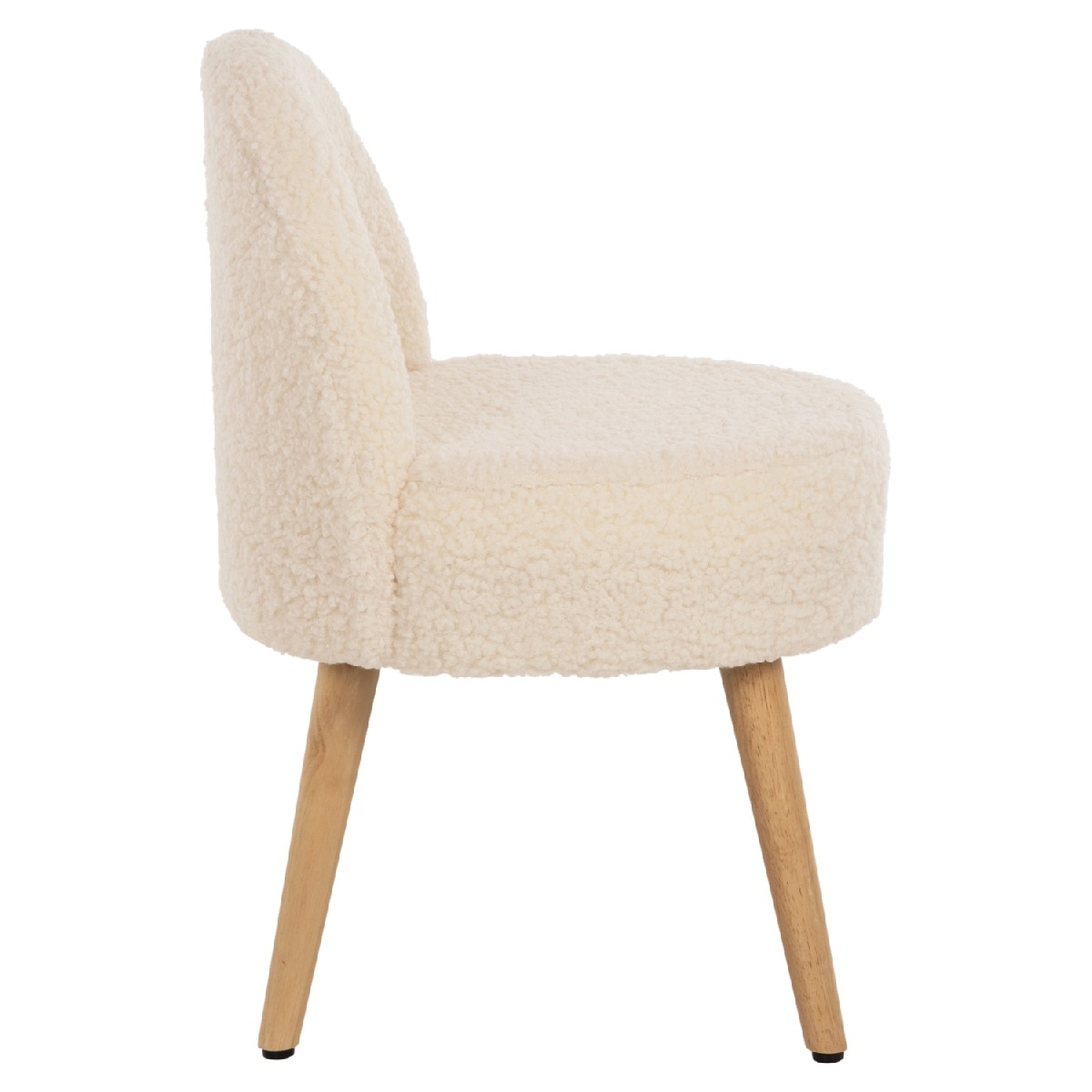 Σκαμπό με πολύ χαμηλή πλάτη YASMINE με επένδυση από ζεστό μπουκλέ ύφασμα σε ΛΕΥΚΗ απόχρωση, με ξύλινα πόδια σε φυσική απόχρωση.<br />