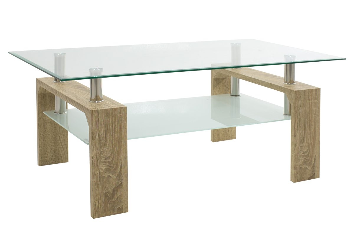 <p>Τεχνικά χαρακτηριστικά:<br />*Επιφάνεια κατασκευασμένη από διαφανές γυαλί ποιότητας και αντοχής, πάχους 6 χιλ Στο κάτω μέρος φέρει βοηθητικό επίπεδο με αποθηκευτικό χώρο από κρύσταλλο αμμοβολής πάχους 5 χιλ.<br />*Φέρει δύο ακριανά ξύλινα πόδια από MDF σχήματος Π και χρώματος sonoma. H σύνδεση μεταξύ των ποδιών και των 2 επιφανειών γίνεται με τέσσερις μεταλλικούς κυλίνδρους δίνοντας εξαιρετική ποιότητα και αντοχή στο βάρος και στο χρόνο.<br />*Οι καταλήξεις των ποδιών διαθέτουν προστατευτικά πλαστικά καλύμματα για την προστασία του πατώματος από ανεπιθύμητες φθορές.</p>