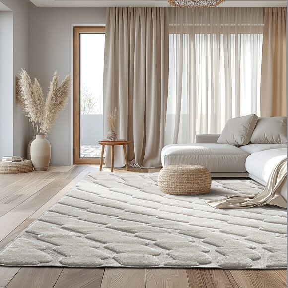 Η πυκνότητα του πέλους εξασφαλίζει όχι μόνο ζεστασιά αλλά και μια αίσθηση πολυτέλειας, ενώ η υφή τους ενισχύει την αισθητική του σαλονιού, προσδίδοντας μια κομψή και αρμονική εμφάνιση. Το βαμβάκι, ως φυσικό υλικό, επιτρέπει στο χαλί να είναι αναπνεύσιμο και εύκολο στη συντήρηση, διασφαλίζοντας μακροχρόνια χρήση και αντοχή.